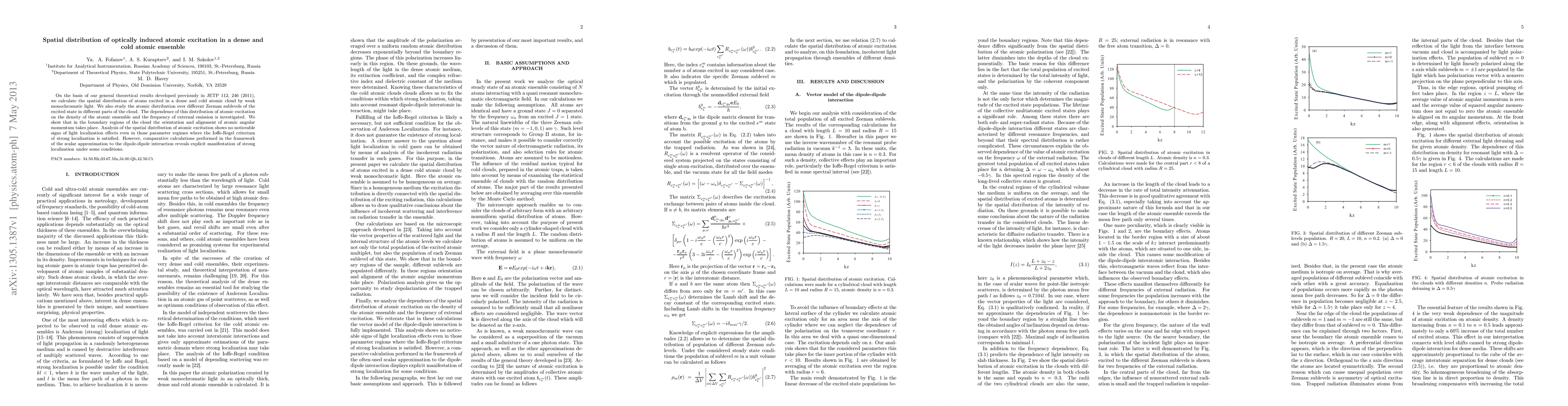On the basis of our general theoretical results developed previously in JETP 112, 246 (2011), we calculate the spatial distribution of atoms excited in a dense and cold atomic cloud by weak monochromatic light. We also study the atomic distribution over different Zeeman sublevels of the excited state in different parts of the cloud. The dependence of this distribution of atomic excitation on the density of the atomic ensemble and the frequency of external emission is investigated. We show that in the boundary regions of the cloud the orientation and alignment of atomic angular momentum takes place. Analysis of the spatial distribution of atomic excitation shows no noticeable signs of light localization effects even in those parameter regimes where the Ioffe-Regel criterium of strong localization is satisfied. However, comparative calculations performed in the framework of the scalar approximation to the dipole-dipole interaction reveals explicit manifestation of strong localization under some conditions.
