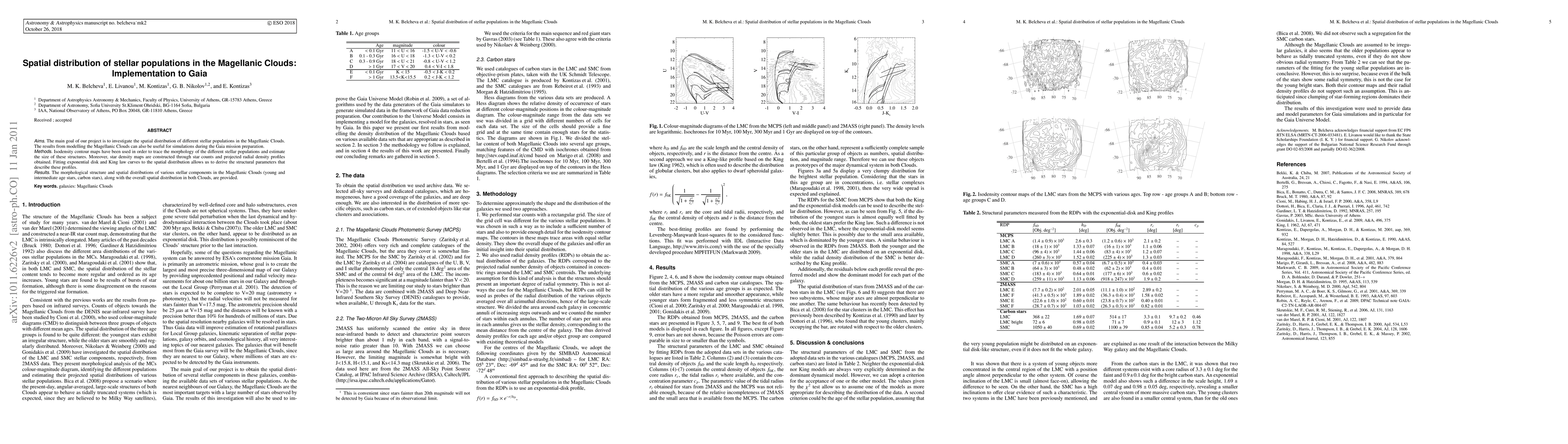 This study investigates the spatial distribution of various stellar populations in the Magellanic Clouds using isodensity contour maps, star density maps, and radial density profiles. The findings, including the structural parameters derived from fitting exponential disk and King law curves, are valuable for simulations in the Gaia mission preparation.