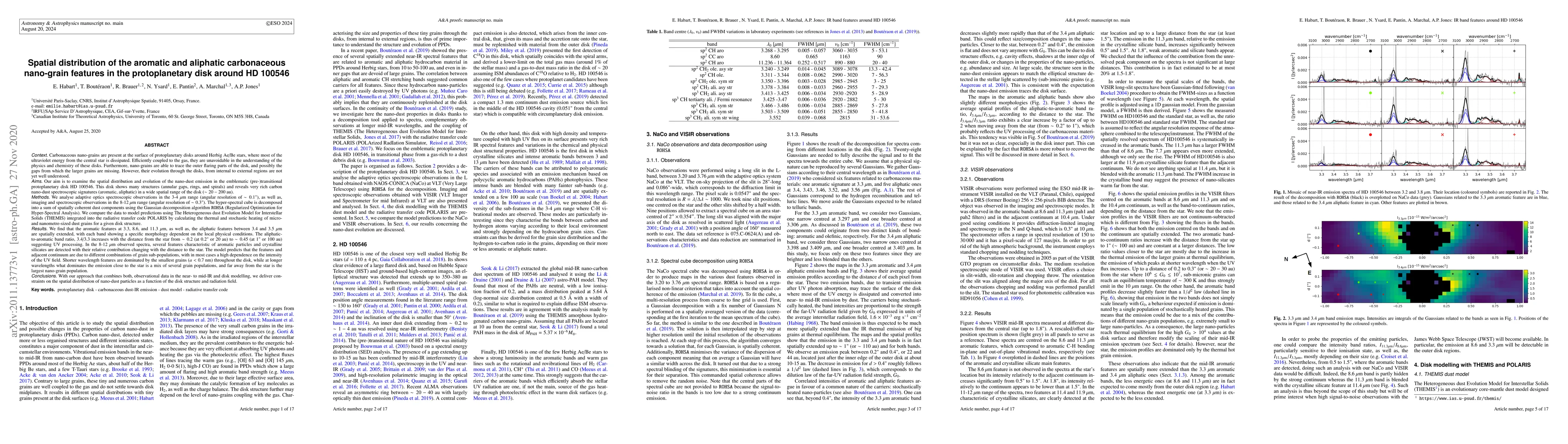 This paper investigates the spatial distribution of aromatic and aliphatic carbonaceous nano-grains in the protoplanetary disk around HD 100546, revealing complex spectroscopic signatures and variations in the aliphatic-to-aromatic band ratio with distance from the star, indicative of UV processing. Models suggest that grain populations and their emission characteristics vary with the local UV field intensity.