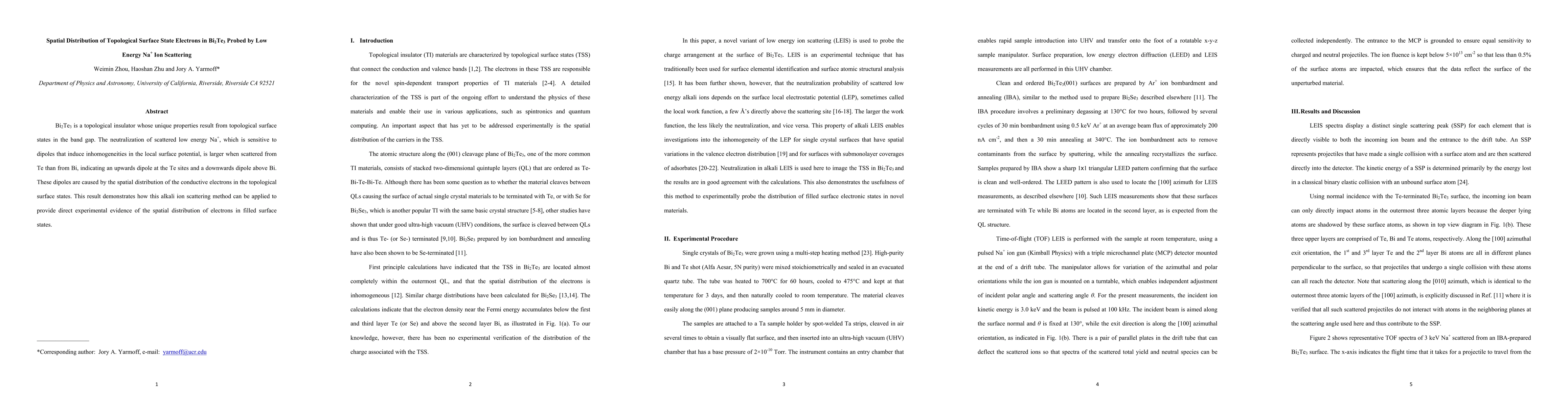 Bi$_2$Te$_3$ is a topological insulator whose unique properties result from topological surface states in the band gap. The neutralization of scattered low energy Na$^+$, which is sensitive to dipoles that induce inhomogeneities in the local surface potential, is larger when scattered from Te than from Bi, indicating an upwards dipole at the Te sites and a downwards dipole above Bi. These dipoles are caused by the spatial distribution of the conductive electrons in the topological surface states. This result demonstrates how this alkali ion scattering method can be applied to provide direct experimental evidence of the spatial distribution of electrons in filled surface states.