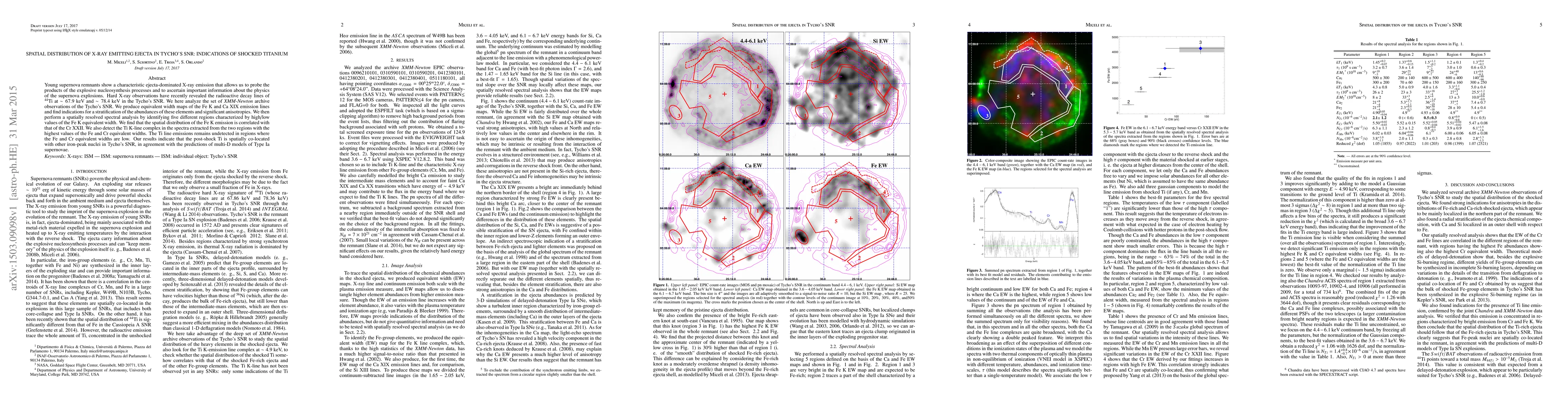 This paper analyzes XMM-Newton observations of Tycho's SNR to investigate the spatial distribution of X-ray emitting ejecta, revealing significant anisotropies and stratification in Fe and Ca abundances. The study finds that shocked Titanium is co-located with iron-peak nuclei, supporting multi-dimensional models of Type Ia supernovae.