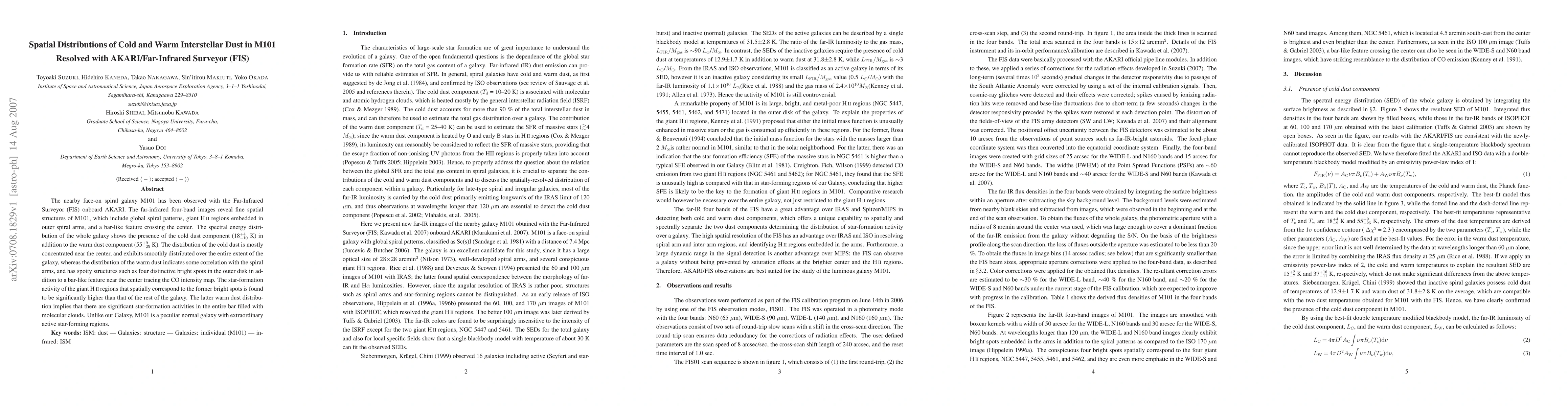 The AKARI/FIS observations of M101 reveal distinct spatial distributions of cold (18 K) and warm (55 K) interstellar dust, with cold dust concentrated near the center and warm dust correlating with star-forming regions in spiral arms and the central bar. The study highlights significant star-formation activities in these regions.