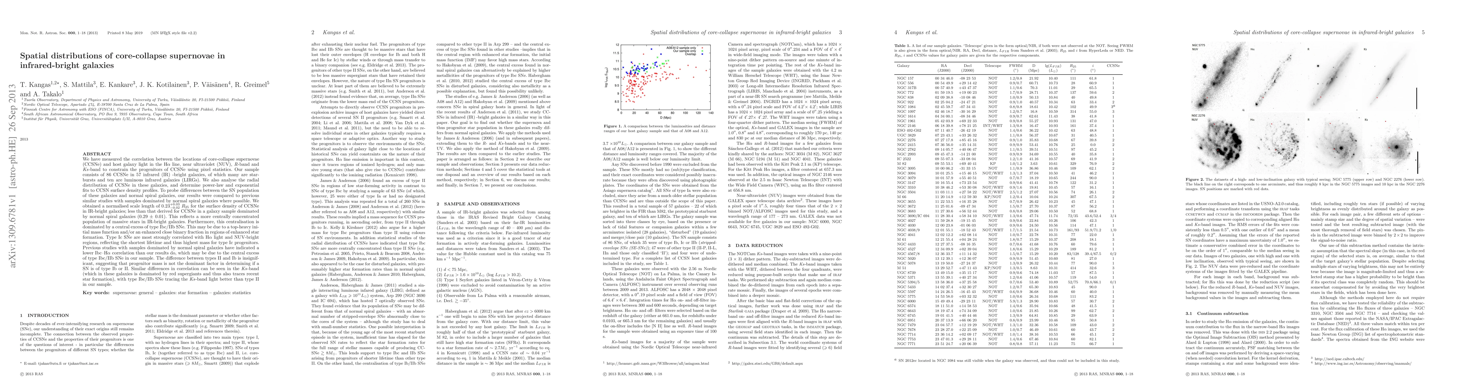 We have measured the correlation between the locations of core-collapse supernovae (CCSNe) and host galaxy light in the Ha line, near ultraviolet (NUV), R-band and Ks-band to constrain the progenitors of CCSNe using pixel statistics. Our sample consists of 86 CCSNe in 57 infrared (IR)-bright galaxies, of which many are starbursts and ten are luminous infrared galaxies (LIRGs). We also analyse the radial distribution of CCSNe in these galaxies, and determine power-law and exponential fits to CCSN surface density profiles. To probe differences between the SNe of these galaxies and normal spiral galaxies, our results were compared to previous studies with samples dominated by normal spiral galaxies where possible. We obtained a normalised scale length of 0.23^{+0.03}_{-0.02} R_25 for the CCSN surface density in IR-bright galaxies; less than that derived for CCSNe in a sample dominated by normal spiral galaxies (0.29 \pm 0.01). This reflects a more centrally concentrated population of massive stars in IR-bright galaxies. Furthermore, this centralisation is dominated by a central excess of type Ibc/IIb SNe. This may be due to a top-heavy initial mass function and/or an enhanced close binary fraction in regions of enhanced star formation. Type Ic SNe are most strongly correlated with Ha light and NUV-bright regions, reflecting the shortest lifetime and thus highest mass for type Ic progenitors. Previous studies with samples dominated by normal spiral galaxies have indicated a lower Ibc-Ha correlation than our results do, which may be due to the central excess of type Ibc/IIb SNe in our sample. The difference between types II and Ib is minimal, suggesting that progenitor mass is not the dominant factor in determining if a SN is of type Ib or II. Similar differences in correlation can be seen in the Ks-band, with type Ibc/IIb SNe tracing the Ks-band light better than type II in our sample.