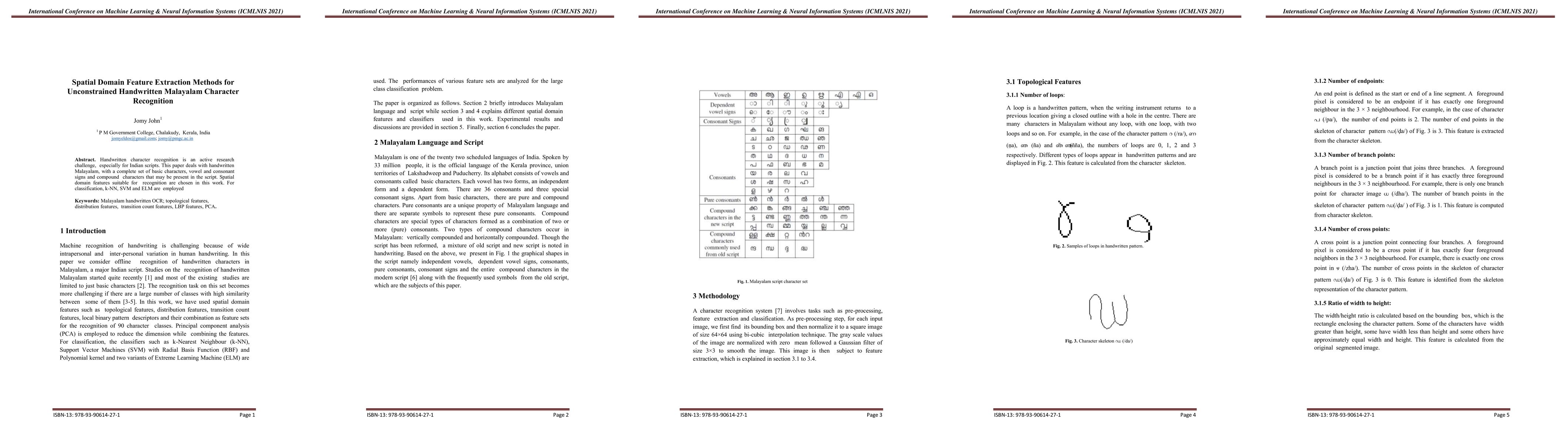 This paper explores spatial domain feature extraction methods for recognizing unconstrained handwritten Malayalam characters, employing k-NN, SVM, and ELM for classification. The study focuses on a comprehensive set of basic, vowel, consonant, and compound characters in the Malayalam script.