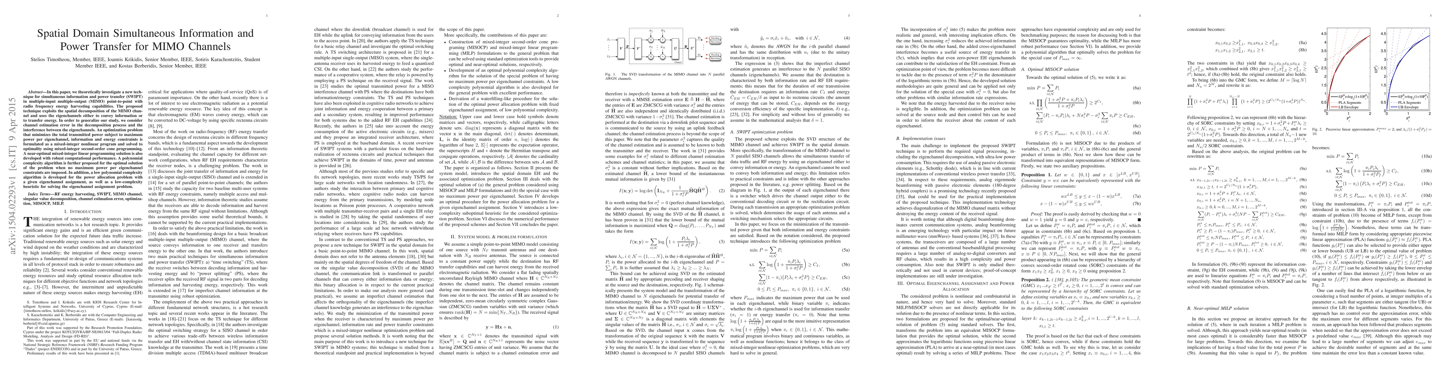 This paper proposes a novel SWIPT technique for MIMO channels that leverages spatial decomposition to either convey information or transfer energy. It formulates an optimization problem to minimize power while considering channel estimation errors and interference, solved via mixed-integer nonlinear programming and a near-optimal mixed-integer linear programming approach.