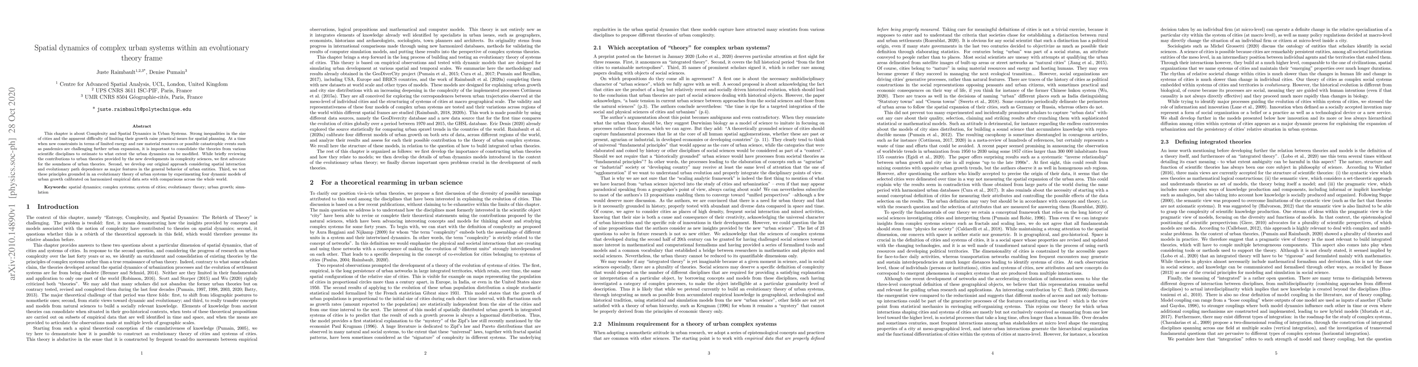 This chapter is about Complexity and Spatial Dynamics in Urban Systems. Strong inequalities in the size of cities and the apparent difficulty of limiting their growth raise practical issues for spatial planning. At a time when new constraints in terms of limited energy and raw material resources or possible catastrophic events such as pandemics are challenging further urban expansion, it is important to consolidate the theories from various scientific disciplines to estimate to what extent the urban dynamics can be modified. While briefly reviewing the contributions to urban theories provided by the new developments in complexity sciences, we first advocate for the soundness of urban theories. Second, we develop our original approach considering spatial interaction and evolutionary path dependence as major features in the general behavior of urban entities. Third, we test these principles grounded in an evolutionary theory of urban systems by experimenting four dynamic models of urban growth calibrated on harmonized empirical data sets with comparisons across the whole world.