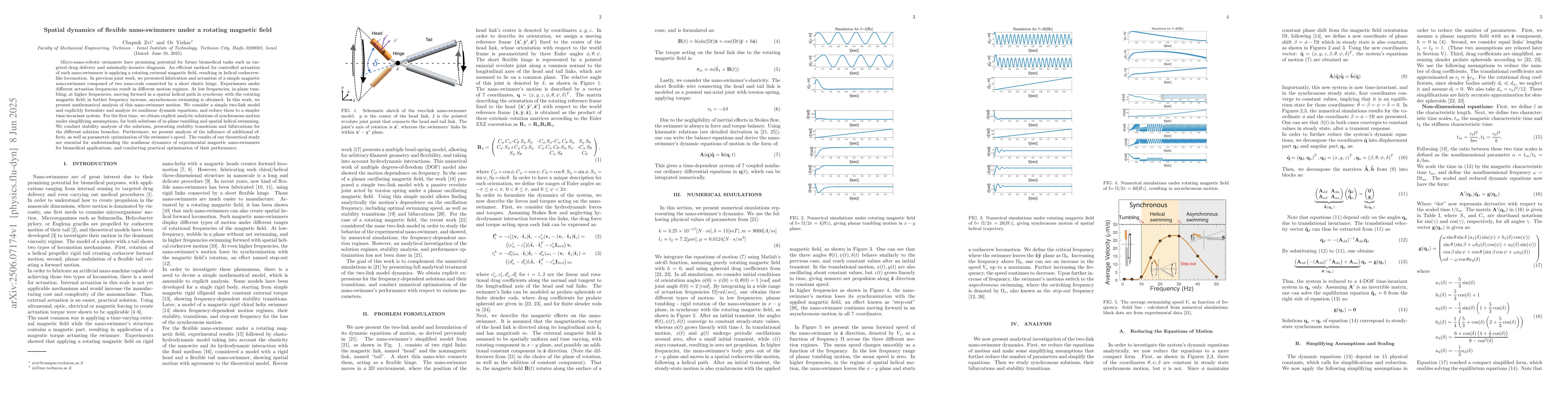 Researchers analyze the motion of magnetic nano-swimmers under a rotating field, finding explicit solutions for synchronized motion and stability transitions with frequency increases.