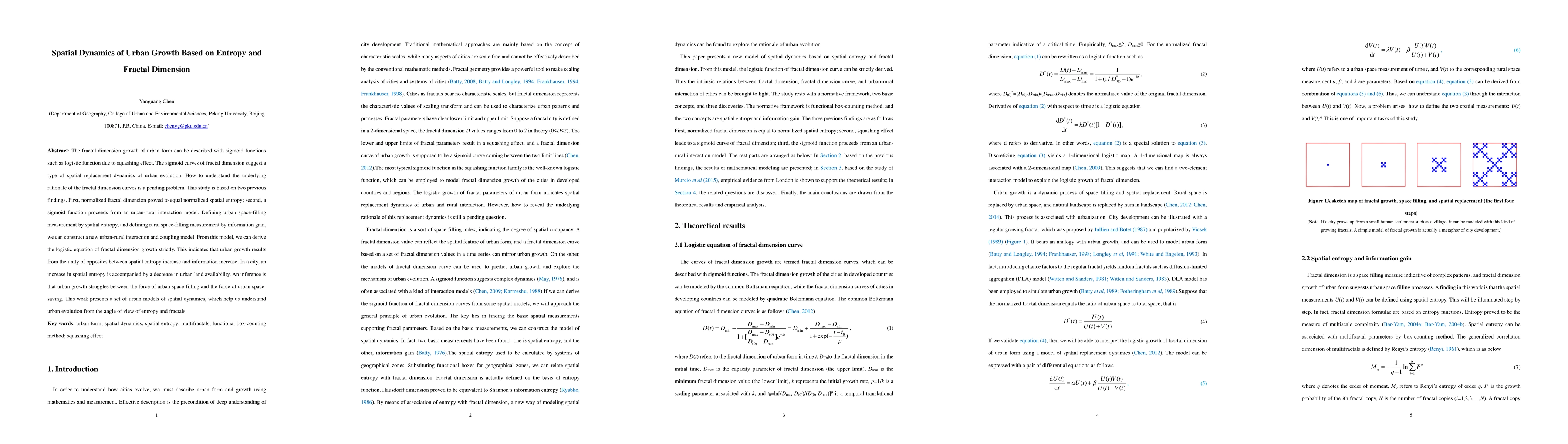 This paper explores the spatial dynamics of urban growth using entropy and fractal dimension, proposing that urban expansion is driven by the interplay between spatial entropy increase and information gain. The study derives a logistic equation for fractal dimension growth from an urban-rural interaction model, suggesting that urban growth is a struggle between space-filling and space-saving forces.
