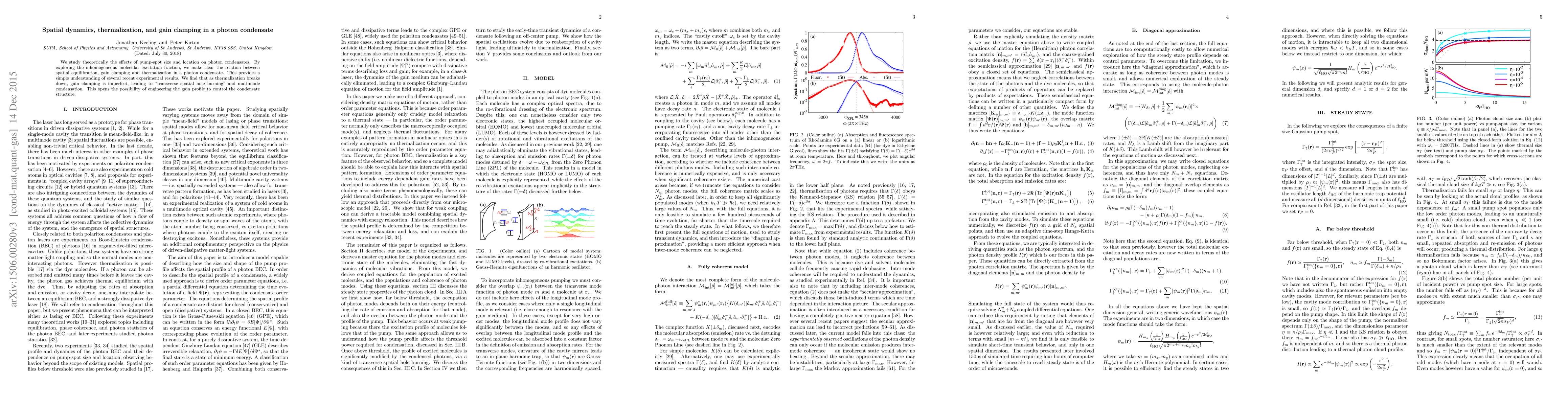This paper theoretically investigates the impact of pump-spot size and location on photon condensates, revealing the connection between spatial equilibration, gain clamping, and thermalization. The study finds that breakdown of thermalization leads to imperfect gain clamping, resulting in transverse spatial hole burning and multimode condensation, suggesting potential for engineering gain profiles to control condensate structure.