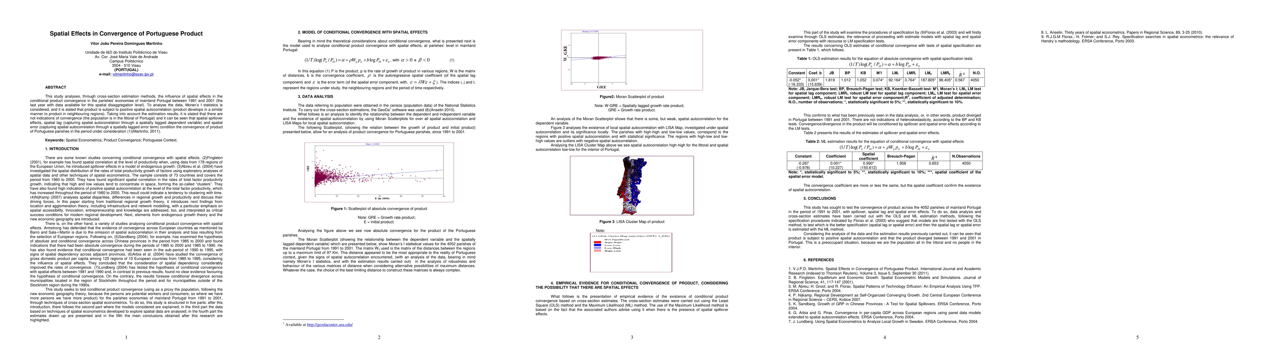 The study examines Portuguese parish economies from 1991-2001, finding no convergence using cross-section estimation. Spatial autocorrelation is noted, with neighboring regions showing similar product development. Spatial spillover effects, both lag and error, are identified as influencing the lack of convergence in coastal parishes.