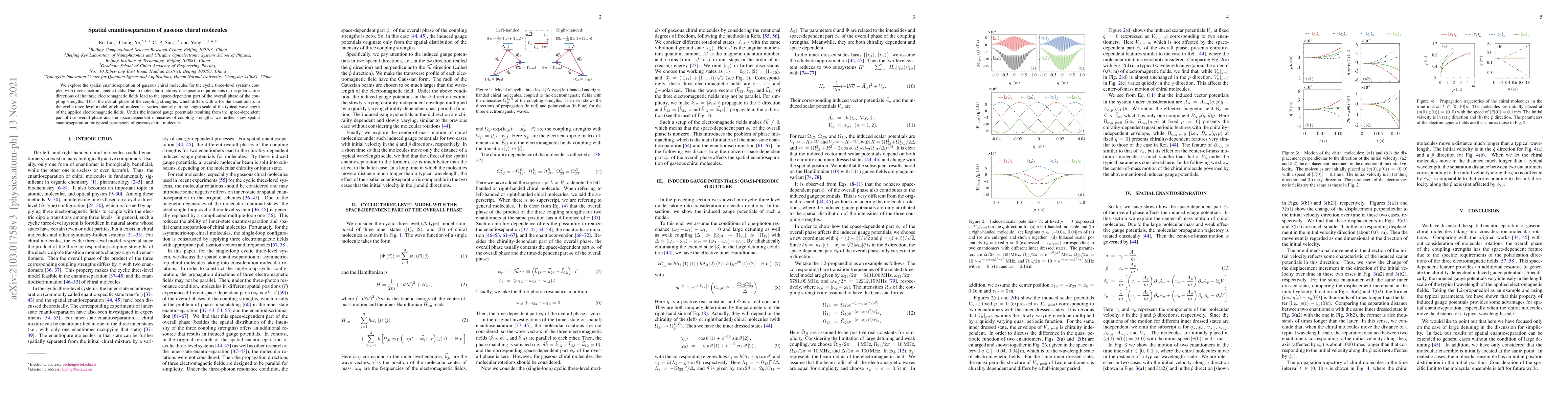 This paper investigates the spatial enantioseparation of gaseous chiral molecules in cyclic three-level systems influenced by three electromagnetic fields. The study reveals that molecular rotations induce variations in the overall phase of coupling strengths, leading to distinct spatial separation of enantiomers.