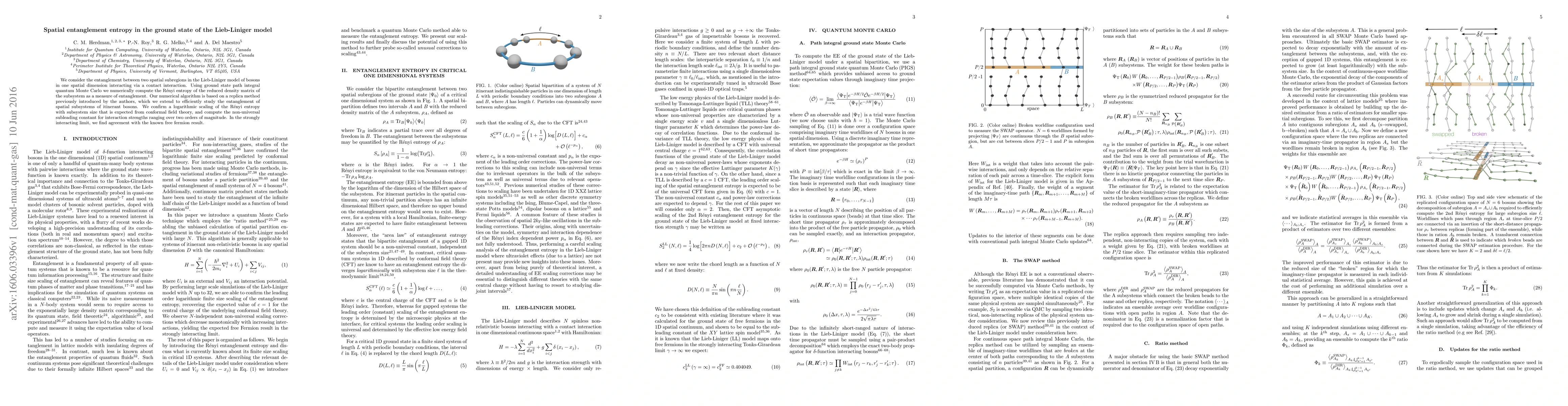 This paper investigates spatial entanglement entropy in the ground state of the Lieb-Liniger model using a ground state path integral quantum Monte Carlo method. The authors confirm a logarithmic scaling of the Rényi entropy with subsystem size, consistent with conformal field theory predictions, and compute the non-universal subleading constant for a wide range of interaction strengths.