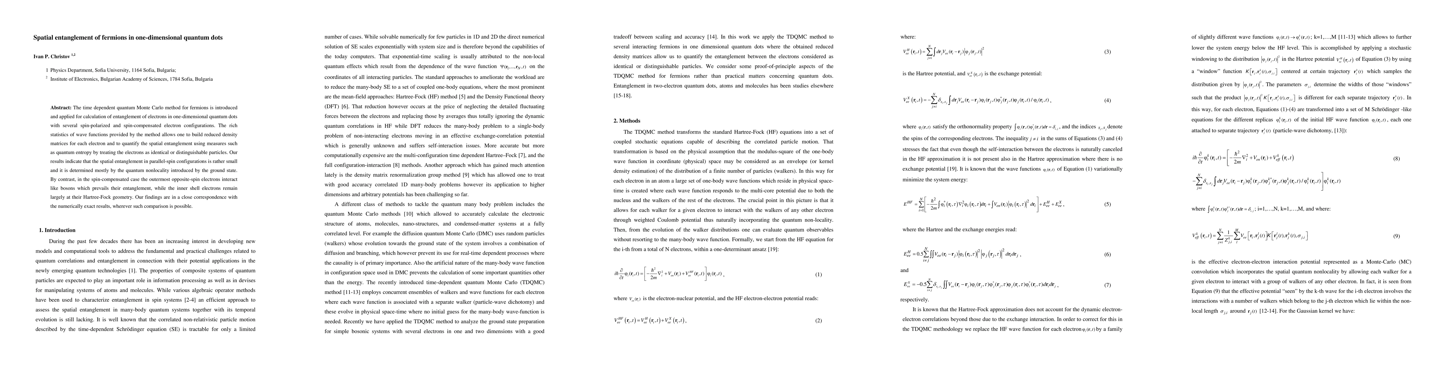 This paper introduces a time-dependent quantum Monte Carlo method to calculate entanglement in one-dimensional quantum dots, finding minimal spatial entanglement in parallel-spin configurations due to ground state quantum nonlocality, while spin-compensated configurations show significant entanglement between outermost opposite-spin electrons.
