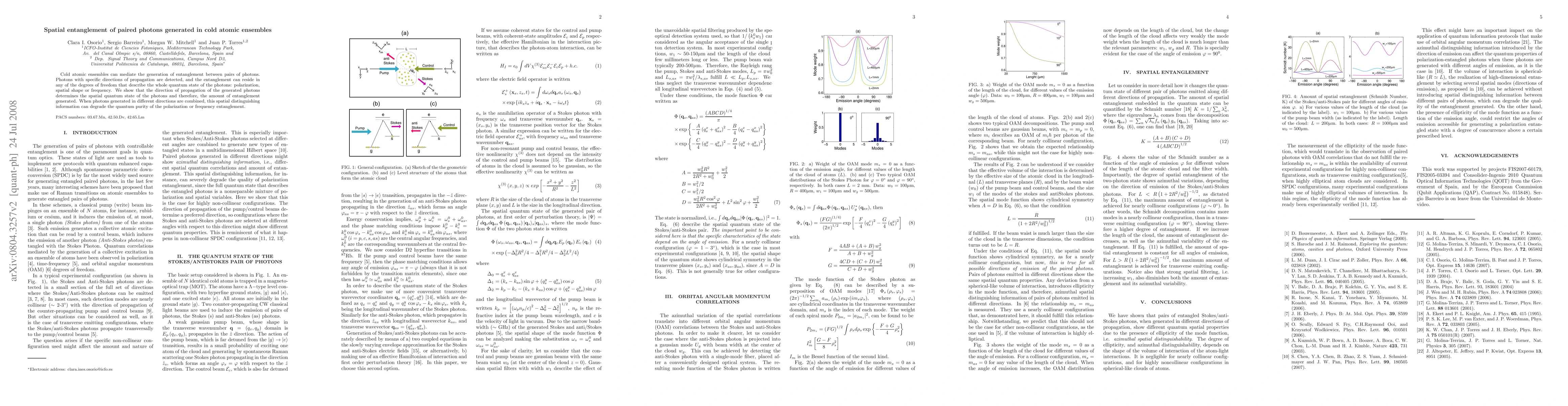 This research demonstrates the generation of entangled photon pairs in cold atomic ensembles, where the direction of photon propagation influences their spatial quantum state and the degree of entanglement. Combining photons from different directions can degrade the purity of polarization or frequency entanglement due to spatial distinguishing information.