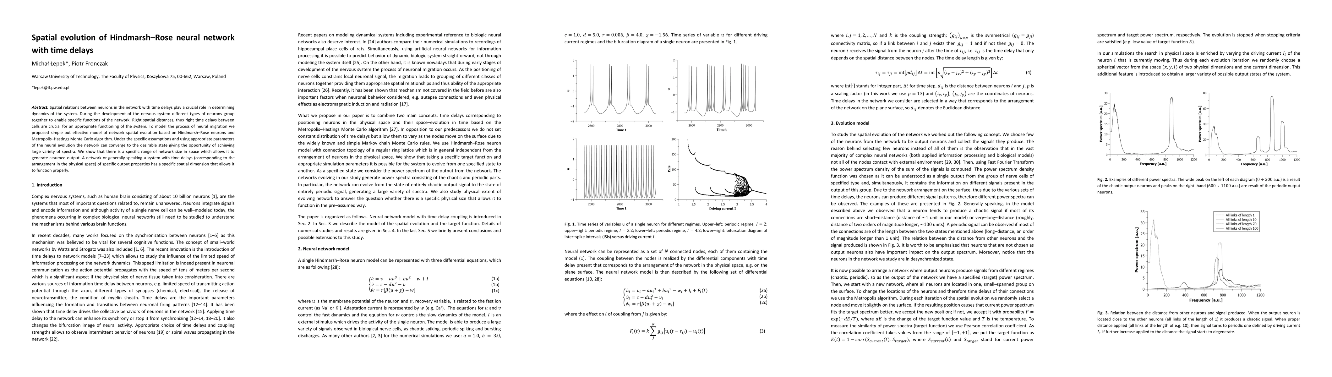 This paper proposes a spatial evolution model for Hindmarsh-Rose neural networks incorporating time delays, using a Metropoli-Hastings Monte Carlo algorithm to simulate neural migration. It demonstrates that specific spatial dimensions and time delays enable the network to achieve a variety of desired dynamical states.