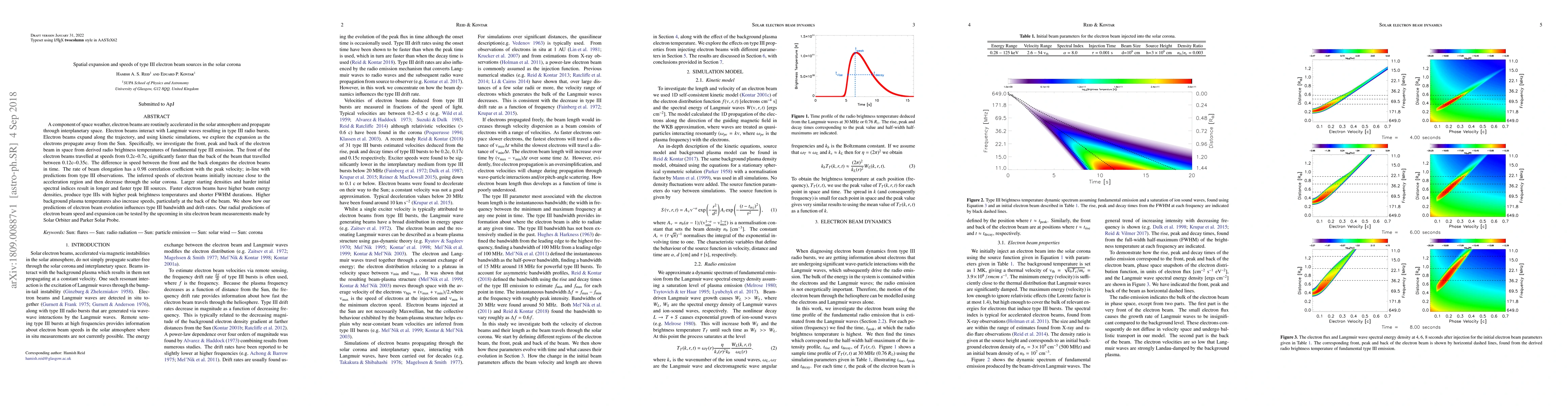 This paper investigates the spatial expansion and speeds of type III electron beams in the solar corona, finding that the front of the beam travels faster (0.2c--0.7c) than the back (0.12c--0.35c), elongating the beam and influencing type III radio burst characteristics. Predictions can be tested by upcoming Solar Orbiter and Parker Solar Probe missions.