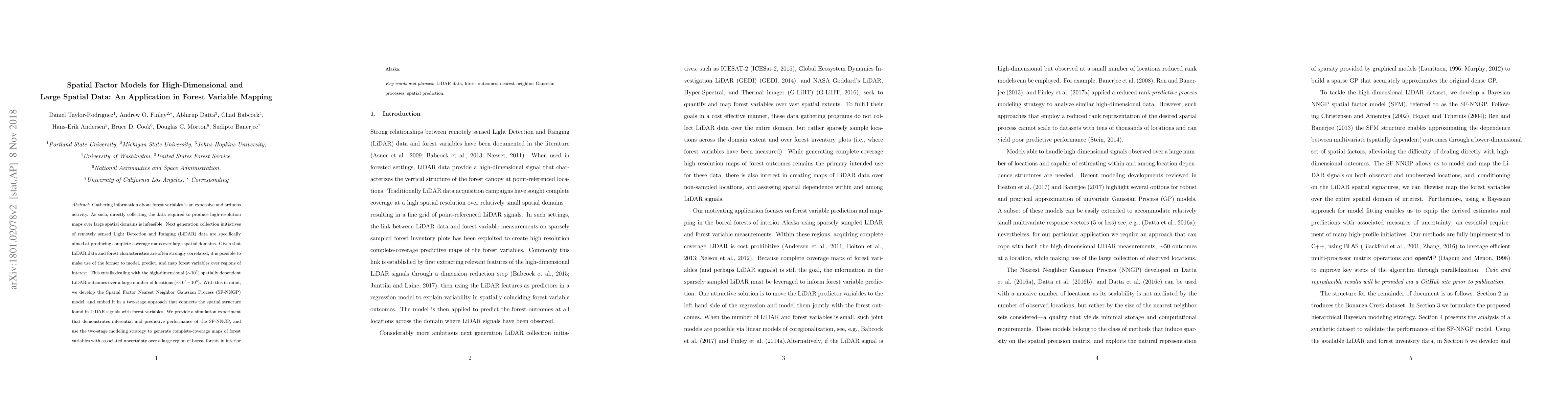 This paper develops the Spatial Factor Nearest Neighbor Gaussian Process (SF-NNGP) model to predict and map forest variables using high-dimensional LiDAR data over large spatial domains. The two-stage approach demonstrates effective inferential and predictive performance, generating complete-coverage maps of forest variables in boreal forests with associated uncertainty.