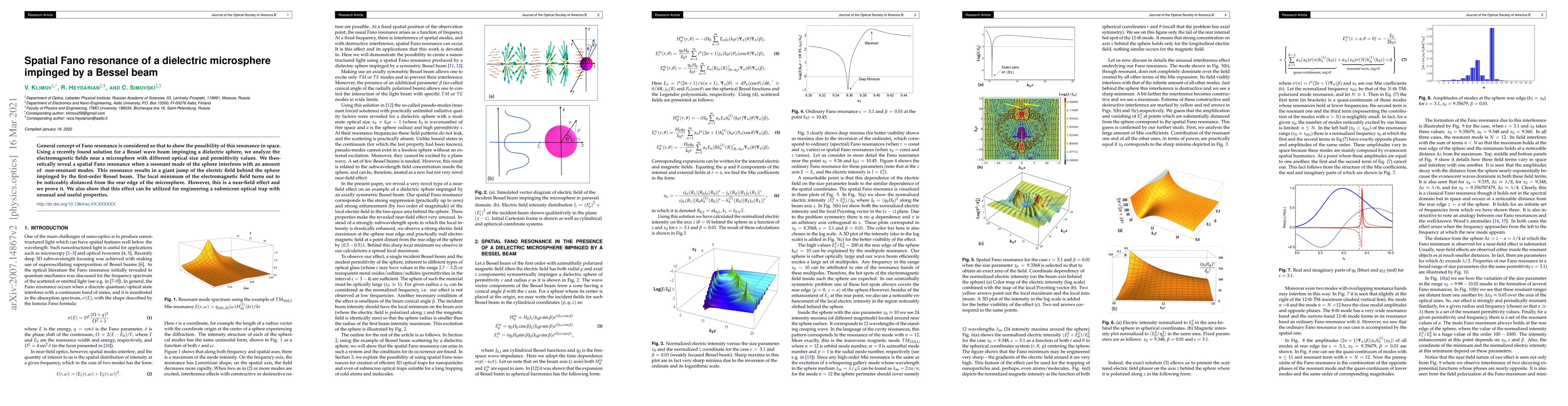 The paper explores the spatial Fano resonance occurring when a Bessel beam interacts with a dielectric microsphere, revealing a significant electric field enhancement due to interference between resonant and non-resonant modes. This near-field phenomenon can be leveraged to design a submicron optical trap with unique functionalities.