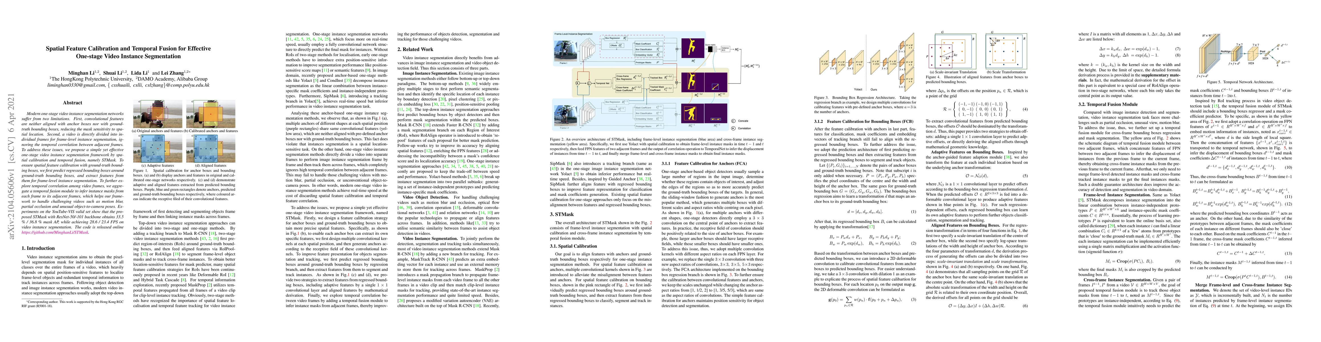 The paper proposes STMask, a one-stage video instance segmentation framework that addresses spatial feature misalignment and temporal independence in frame-level segmentation by incorporating spatial calibration and temporal fusion. The method achieves improved performance on YouTube-VIS with higher mask AP and FPS.