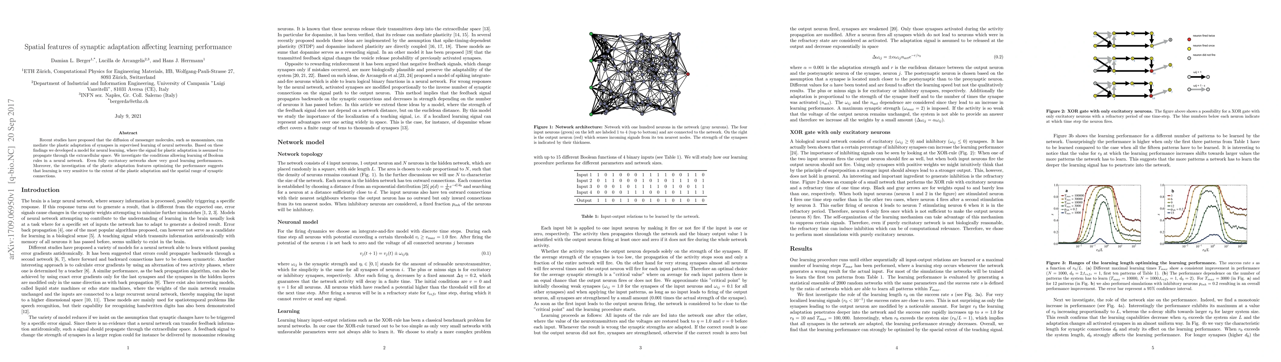 Recent studies have proposed that the diffusion of messenger molecules, such as monoamines, can mediate the plastic adaptation of synapses in supervised learning of neural networks. Based on these findings we developed a model for neural learning, where the signal for plastic adaptation is assumed to propagate through the extracellular space. We investigate the conditions allowing learning of Boolean rules in a neural network. Even fully excitatory networks show very good learning performances. Moreover, the investigation of the plastic adaptation features optimizing the performance suggests that learning is very sensitive to the extent of the plastic adaptation and the spatial range of synaptic connections.