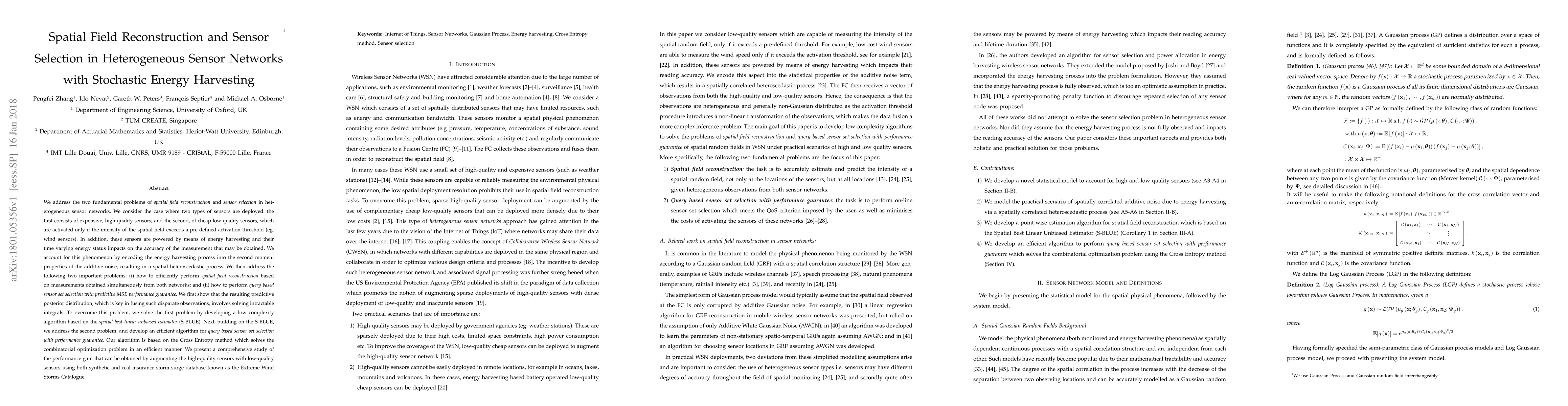 We address the two fundamental problems of spatial field reconstruction and sensor selection in het- erogeneous sensor networks. We consider the case where two types of sensors are deployed: the first consists of expensive, high quality sensors; and the second, of cheap low quality sensors, which are activated only if the intensity of the spatial field exceeds a pre-defined activation threshold (eg. wind sensors). In addition, these sensors are powered by means of energy harvesting and their time varying energy status impacts on the accuracy of the measurement that may be obtained. We account for this phenomenon by encoding the energy harvesting process into the second moment properties of the additive noise, resulting in a spatial heteroscedastic process. We then address the following two important problems: (i) how to efficiently perform spatial field reconstruction based on measurements obtained simultaneously from both networks; and (ii) how to perform query based sensor set selection with predictive MSE performance guarantee. We first show that the resulting predictive posterior distribution, which is key in fusing such disparate observations, involves solving intractable integrals. To overcome this problem, we solve the first problem by developing a low complexity algorithm based on the spatial best linear unbiased estimator (S-BLUE). Next, building on the S-BLUE, we address the second problem, and develop an efficient algorithm for query based sensor set selection with performance guarantee. Our algorithm is based on the Cross Entropy method which solves the combinatorial optimization problem in an efficient manner. We present a comprehensive study of the performance gain that can be obtained by augmenting the high-quality sensors with low-quality sensors using both synthetic and real insurance storm surge database known as the Extreme Wind Storms Catalogue.