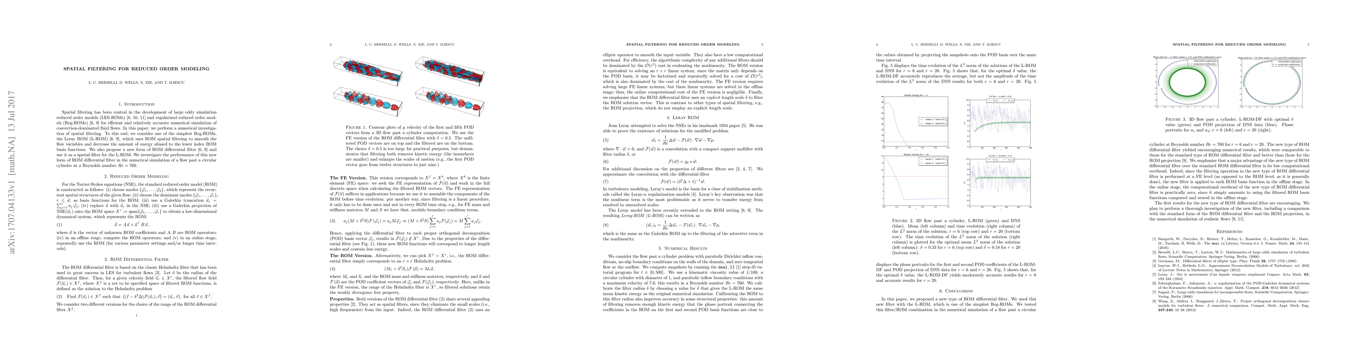 This paper investigates spatial filtering for reduced order modeling in fluid dynamics, proposing a new filter to improve performance in simulating flows around objects.