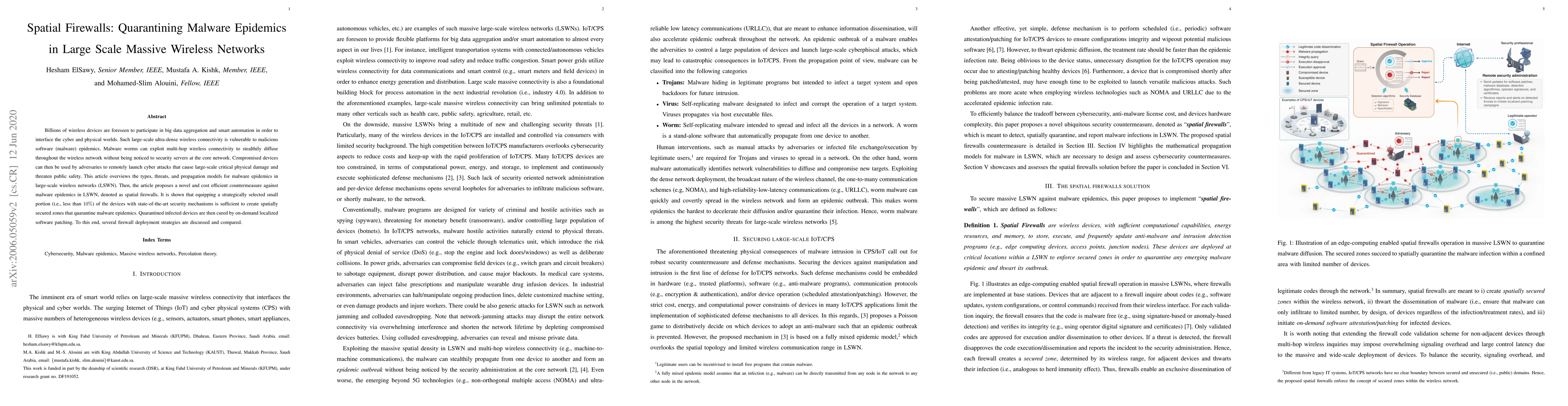 This paper discusses the threat of malware epidemics in large-scale wireless networks and proposes spatial firewalls as a cost-effective countermeasure. It demonstrates that equipping a small fraction of devices with advanced security mechanisms can create secure zones to quarantine and cure malware infections.