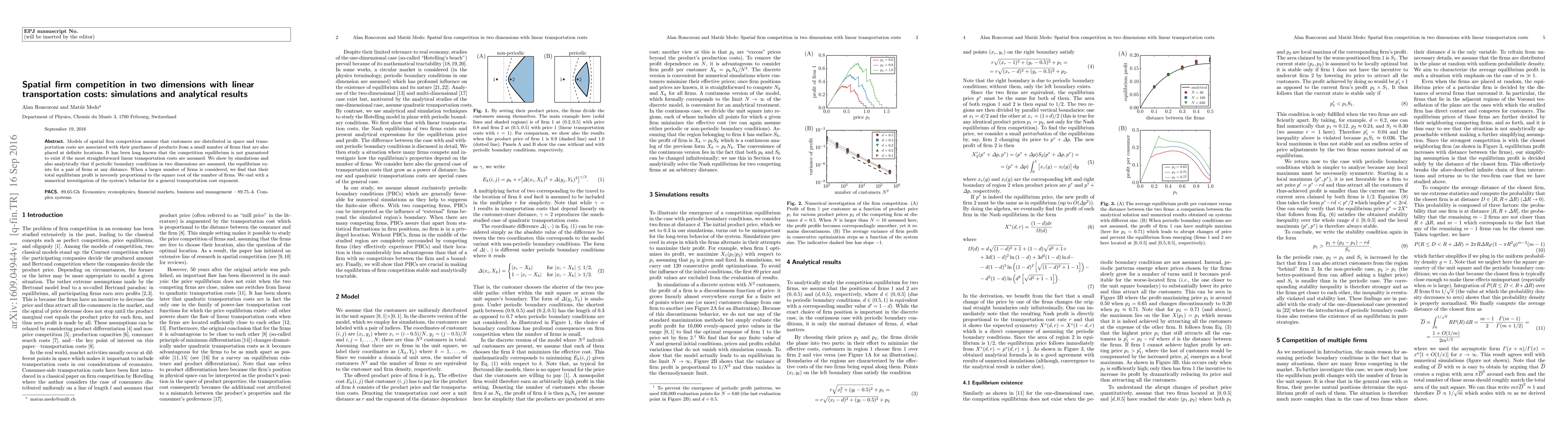 This paper explores spatial firm competition in a two-dimensional space with linear transportation costs, demonstrating through simulations and analytical methods that equilibrium exists under periodic boundary conditions for any pair of firms. It also reveals that the total equilibrium profit of multiple firms is inversely proportional to the square root of the number of firms.