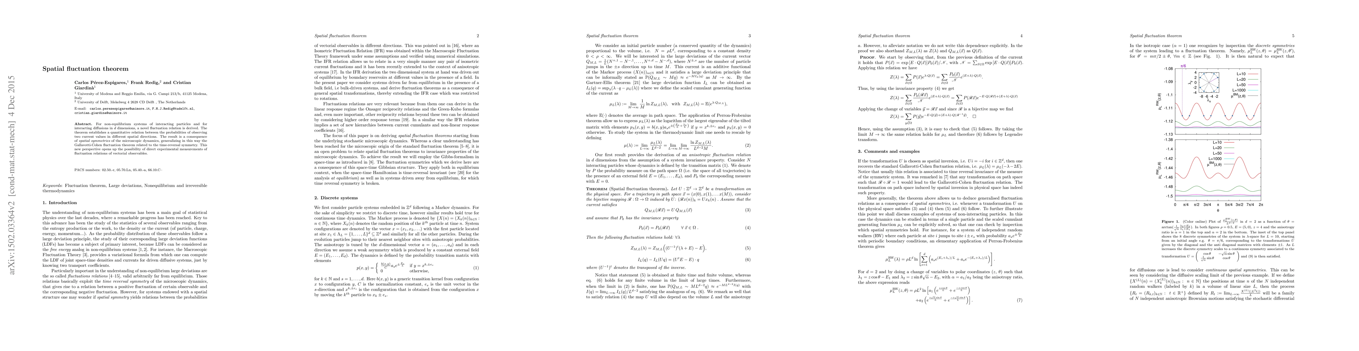 The Spatial Fluctuation Theorem provides a quantitative relation between the probabilities of observing current values in different spatial directions for non-equilibrium systems, generalizing the Gallavotti-Cohen theorem related to time-reversal symmetry. This new perspective enables direct experimental measurements of fluctuation relations of vectorial observables.