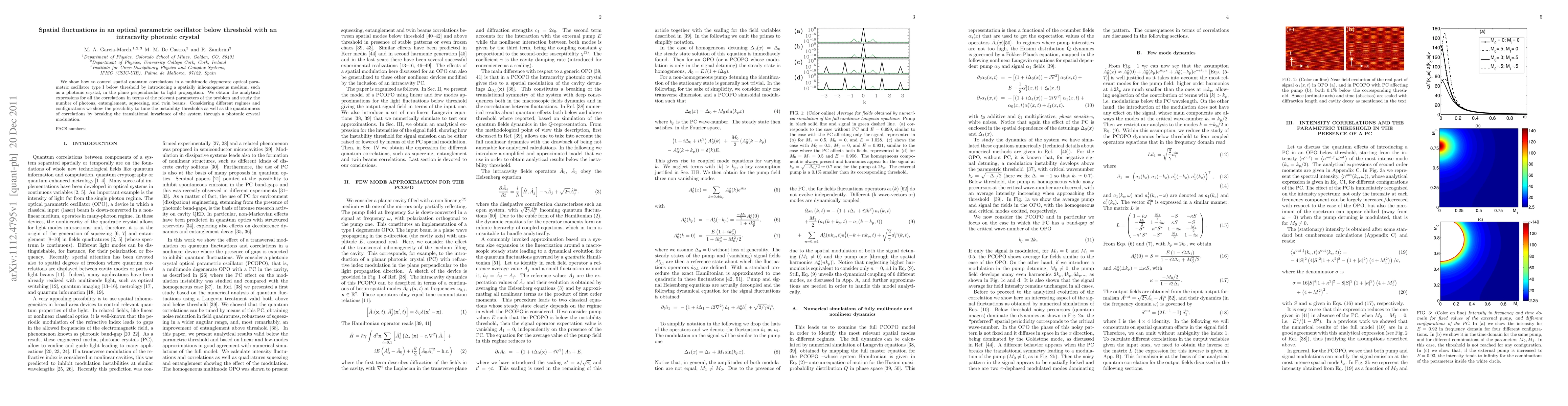 This paper investigates how incorporating a photonic crystal into a multimode optical parametric oscillator below threshold can control spatial quantum correlations, providing analytical expressions for photon number, entanglement, squeezing, and twin beams. The study demonstrates the ability to tune instability thresholds and quantumness by breaking translational invariance through photonic crystal modulation.