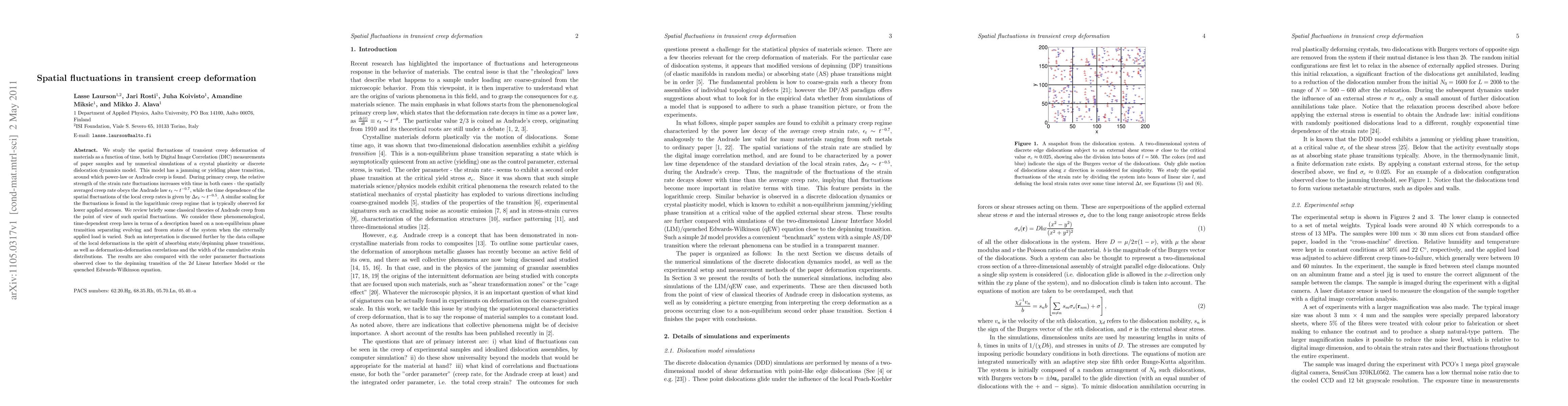 We study the spatial fluctuations of transient creep deformation of materials as a function of time, both by Digital Image Correlation (DIC) measurements of paper samples and by numerical simulations of a crystal plasticity or discrete dislocation dynamics model. This model has a jamming or yielding phase transition, around which power-law or Andrade creep is found. During primary creep, the relative strength of the strain rate fluctuations increases with time in both cases - the spatially averaged creep rate obeys the Andrade law $\epsilon_t \sim t^{-0.7}$, while the time dependence of the spatial fluctuations of the local creep rates is given by $\Delta \epsilon_t \sim t^{-0.5}$. A similar scaling for the fluctuations is found in the logarithmic creep regime that is typically observed for lower applied stresses. We review briefly some classical theories of Andrade creep from the point of view of such spatial fluctuations. We consider these phenomenological, time-dependent creep laws in terms of a description based on a non-equilibrium phase transition separating evolving and frozen states of the system when the externally applied load is varied. Such an interpretation is discussed further by the data collapse of the local deformations in the spirit of absorbing state/depinning phase transitions, as well as deformation-deformation correlations and the width of the cumulative strain distributions. The results are also compared with the order parameter fluctuations observed close to the depinning transition of the 2$d$ Linear Interface Model or the quenched Edwards-Wilkinson equation.