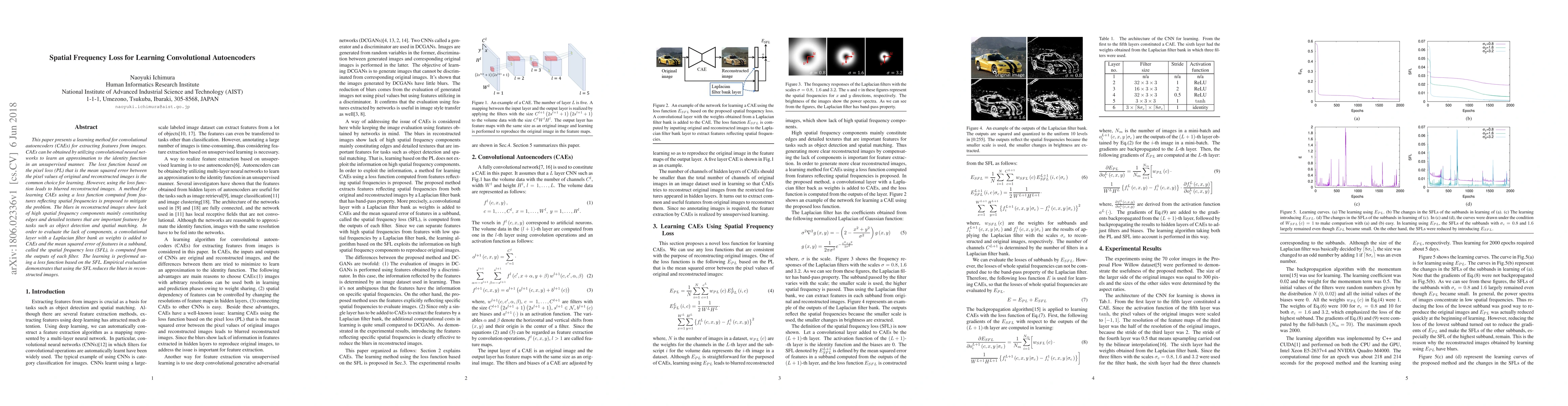 This paper presents a learning method for convolutional autoencoders (CAEs) for extracting features from images. CAEs can be obtained by utilizing convolutional neural networks to learn an approximation to the identity function in an unsupervised manner. The loss function based on the pixel loss (PL) that is the mean squared error between the pixel values of original and reconstructed images is the common choice for learning. However, using the loss function leads to blurred reconstructed images. A method for learning CAEs using a loss function computed from features reflecting spatial frequencies is proposed to mitigate the problem. The blurs in reconstructed images show lack of high spatial frequency components mainly constituting edges and detailed textures that are important features for tasks such as object detection and spatial matching. In order to evaluate the lack of components, a convolutional layer with a Laplacian filter bank as weights is added to CAEs and the mean squared error of features in a subband, called the spatial frequency loss (SFL), is computed from the outputs of each filter. The learning is performed using a loss function based on the SFL. Empirical evaluation demonstrates that using the SFL reduces the blurs in reconstructed images.