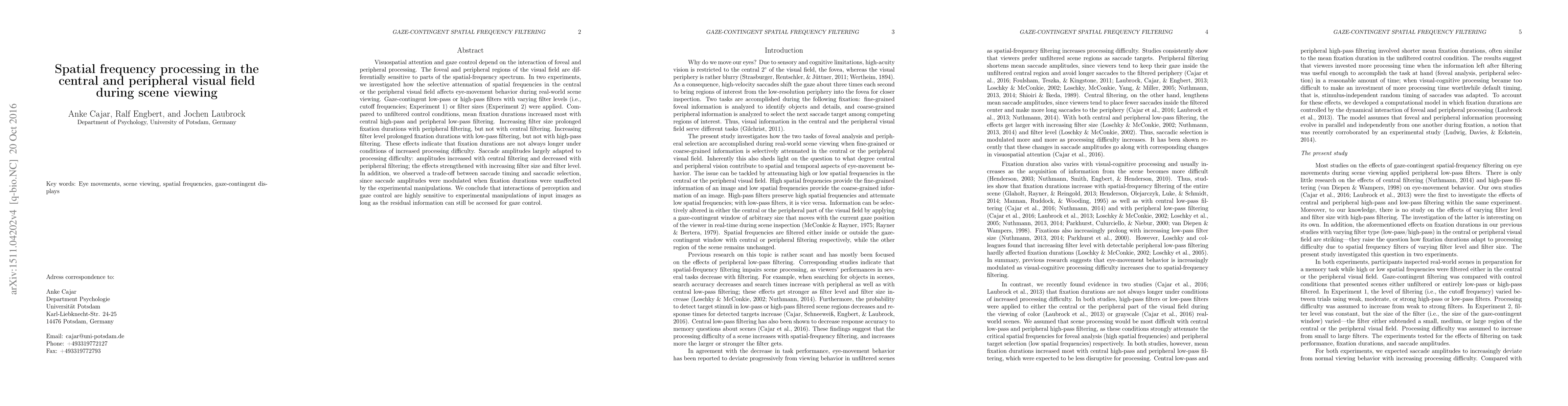 This study explores how spatial frequency attenuation in the central and peripheral visual fields influences eye movement behavior during scene viewing. Results show that central high-pass and peripheral low-pass filtering increase fixation durations, while saccade amplitudes adapt to the processing difficulty, indicating complex interactions between perception and gaze control.