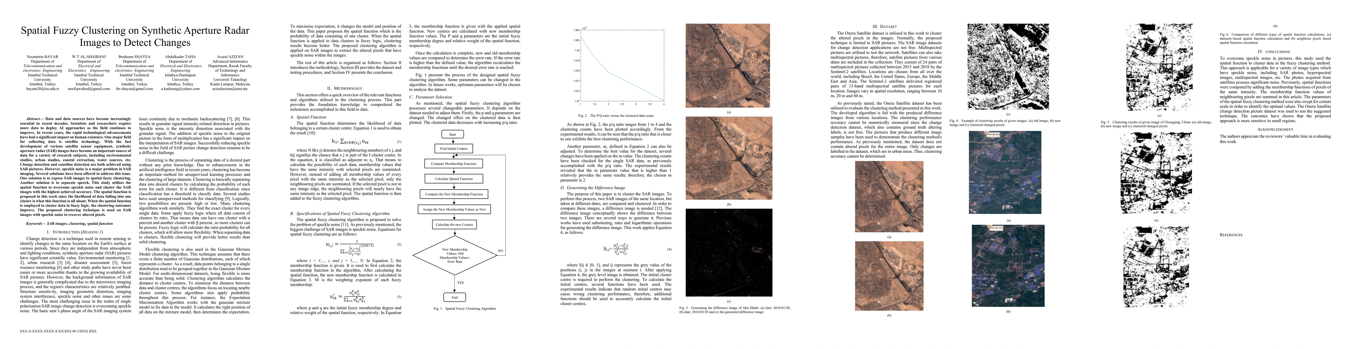 Data and data sources have become increasingly essential in recent decades. Scientists and researchers require more data to deploy AI approaches as the field continues to improve. In recent years, the rapid technological advancements have had a significant impact on human existence. One major field for collecting data is satellite technology. With the fast development of various satellite sensor equipment, synthetic aperture radar (SAR) images have become an important source of data for a variety of research subjects, including environmental studies, urban studies, coastal extraction, water sources, etc. Change detection and coastline detection are both achieved using SAR pictures. However, speckle noise is a major problem in SAR imaging. Several solutions have been offered to address this issue. One solution is to expose SAR images to spatial fuzzy clustering. Another solution is to separate speech. This study utilises the spatial function to overcome speckle noise and cluster the SAR images with the highest achieved accuracy. The spatial function is proposed in this work since the likelihood of data falling into one cluster is what this function is all about. When the spatial function is employed to cluster data in fuzzy logic, the clustering outcomes improve. The proposed clustering technique is us