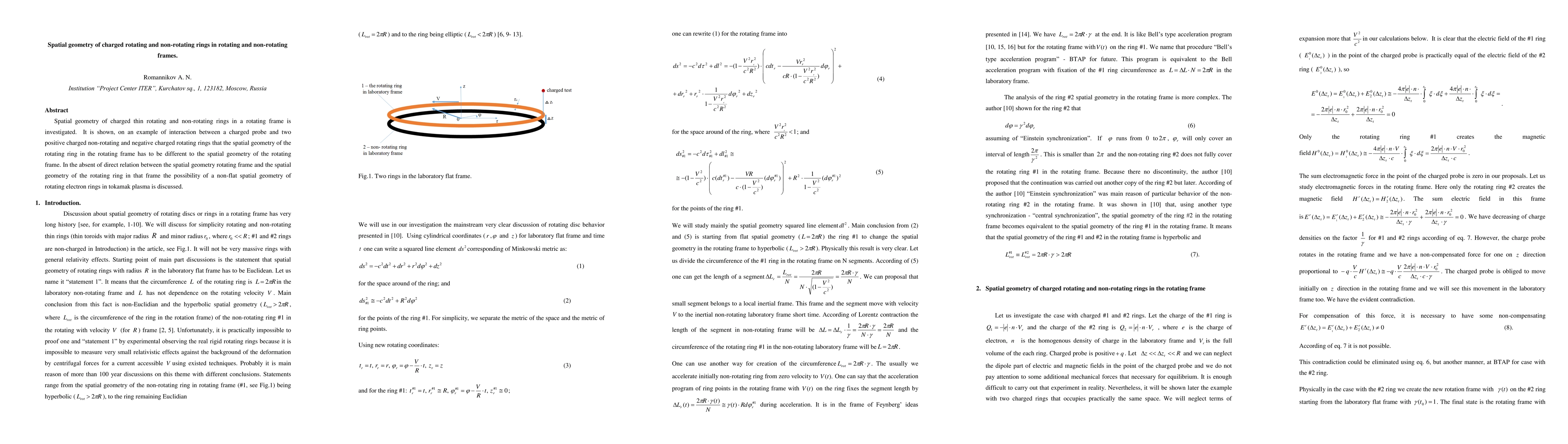 This paper investigates the spatial geometry of charged rotating and non-rotating rings in both rotating and non-rotating frames, demonstrating that the geometry of a rotating ring in a rotating frame differs from that of the frame itself. It discusses the implications for the potential non-flat spatial geometry of rotating electron rings in tokamak plasma.