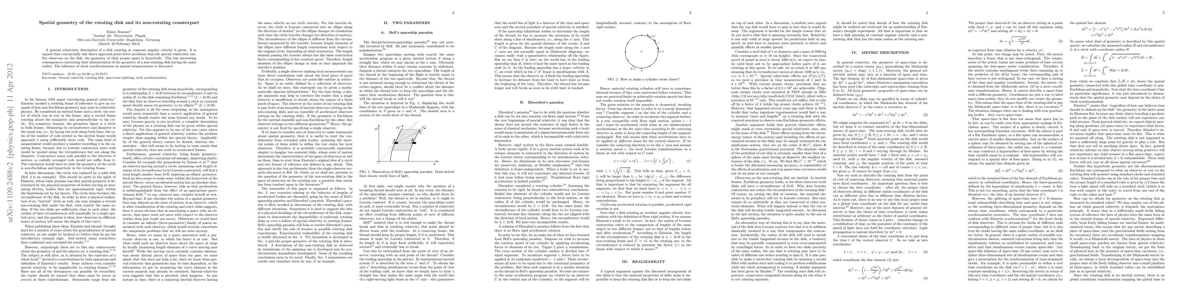 A general relativistic description of a disk rotating at constant angular velocity is given. It is argued that conceptually this direct approach poses fewer problems than the special relativistic one. For observers on the disk, the geometry of their proper space is hyperbolic. This has interesting consequences concerning their interpretation of the geometry of a non-rotating disk having the same radius. The influence of clock synchronization on spatial measurements is discussed.