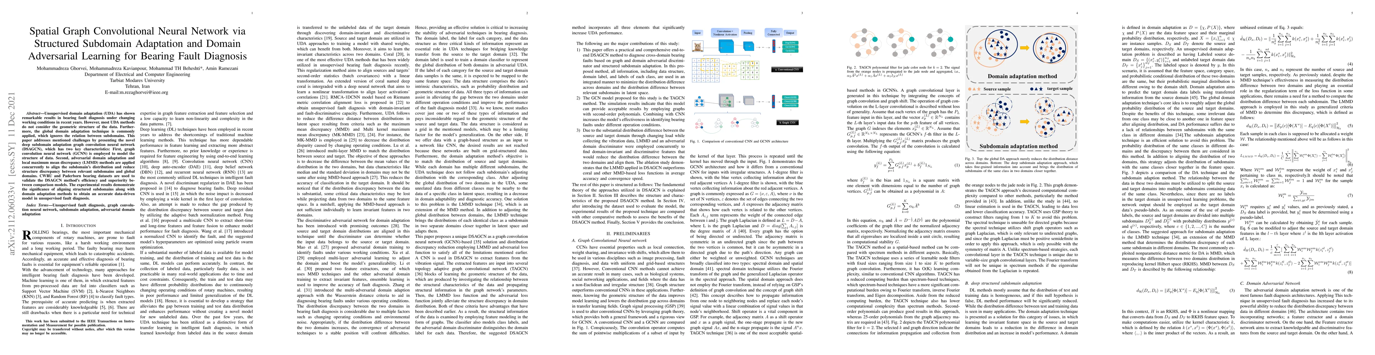 This research introduces the Spatial Graph Convolutional Neural Network (DSAGCN) for bearing fault diagnosis under varying working conditions. DSAGCN utilizes a Graph Convolutional Neural Network (GCNN) to model data structure, concurrently applying adversarial domain adaptation and Local Maximum Mean Discrepancy (LMMD) methods to align subdomain distributions and reduce structural discrepancies.