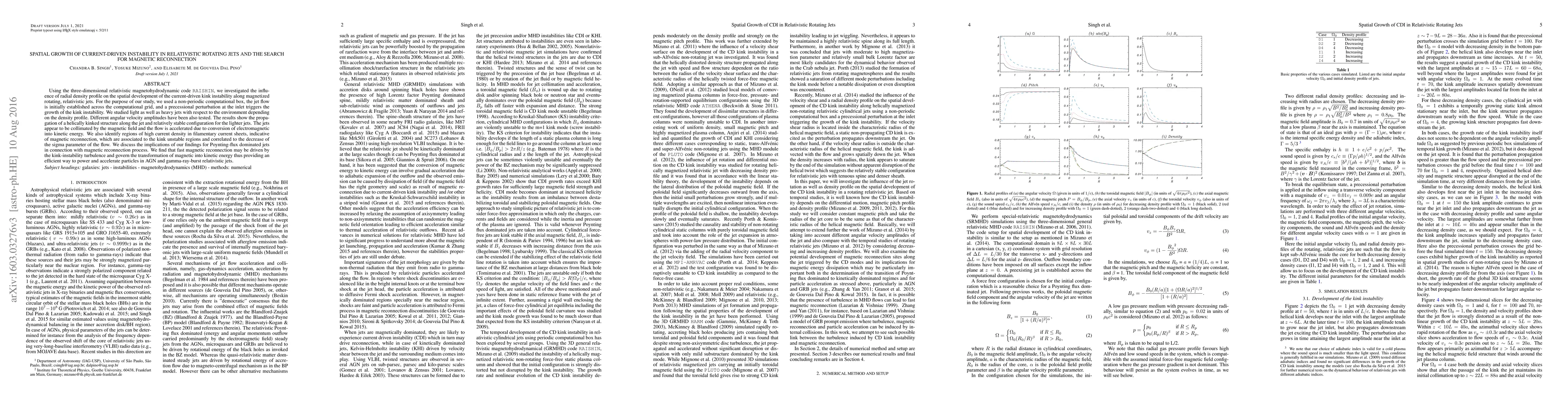 This study uses a relativistic magnetohydrodynamic code to explore how radial density profiles affect the kink instability in rotating, relativistic jets. The research identifies regions of magnetic reconnection linked to kink instability, suggesting a mechanism for efficient energy conversion and particle acceleration in AGN and gamma-ray-burst jets.