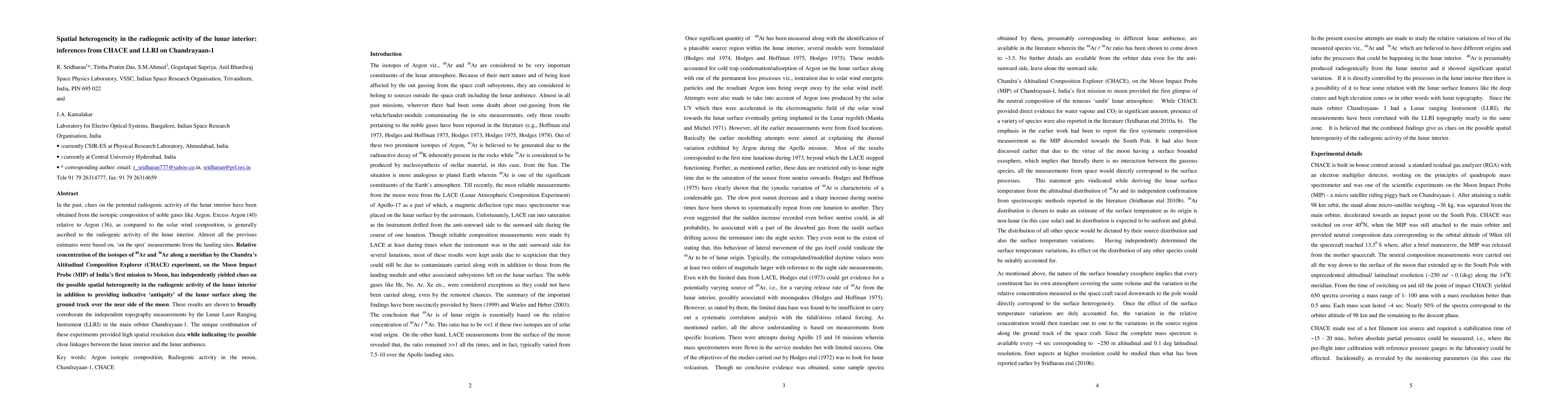 This paper investigates the spatial heterogeneity in the radiogenic activity of the lunar interior using data from the Chandra's Altitudinal Composition Explorer (CHACE) and the Lunar Laser Ranging Instrument (LLRI) on India's Chandrayaan-1 mission. Findings suggest a correlation between the isotopic composition of Argon and the lunar interior's radiogenic activity, indicating potential spatial variations.