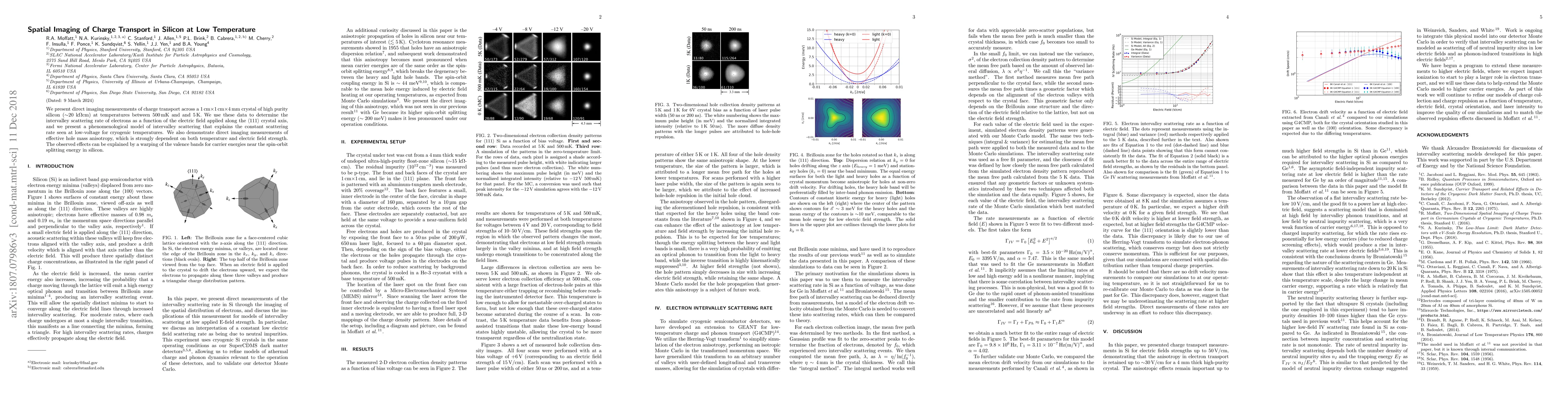 This research directly images charge transport in a large silicon crystal at cryogenic temperatures, determining intervalley scattering rates and presenting a model. It also reveals temperature- and field-dependent hole mass anisotropy, attributed to valence band warping near spin-orbit splitting energy.