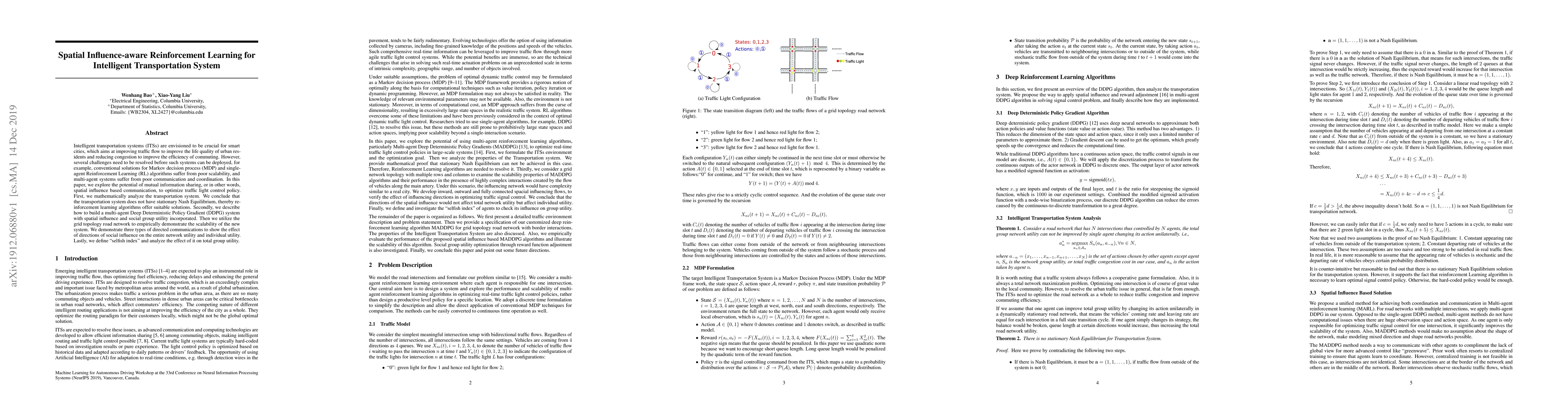 Intelligent transportation systems (ITSs) are envisioned to be crucial for smart cities, which aims at improving traffic flow to improve the life quality of urban residents and reducing congestion to improve the efficiency of commuting. However, several challenges need to be resolved before such systems can be deployed, for example, conventional solutions for Markov decision process (MDP) and single-agent Reinforcement Learning (RL) algorithms suffer from poor scalability, and multi-agent systems suffer from poor communication and coordination. In this paper, we explore the potential of mutual information sharing, or in other words, spatial influence based communication, to optimize traffic light control policy. First, we mathematically analyze the transportation system. We conclude that the transportation system does not have stationary Nash Equilibrium, thereby reinforcement learning algorithms offer suitable solutions. Secondly, we describe how to build a multi-agent Deep Deterministic Policy Gradient (DDPG) system with spatial influence and social group utility incorporated. Then we utilize the grid topology road network to empirically demonstrate the scalability of the new system. We demonstrate three types of directed communications to show the effect of directions of social influence on the entire network utility and individual utility. Lastly, we define "selfish index" and analyze the effect of it on total group utility.