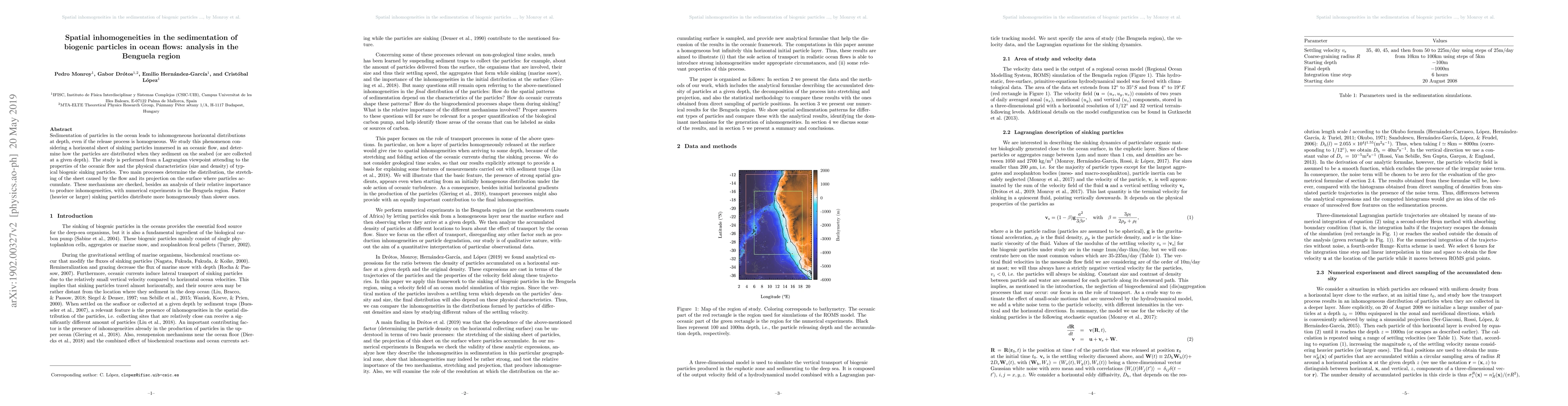 This paper investigates the spatial inhomogeneities in the sedimentation of biogenic particles in ocean flows, focusing on the Benguela region. It finds that particle distribution is influenced by the oceanic flow and the physical characteristics of the particles, leading to inhomogeneous horizontal distributions despite a homogeneous release process.