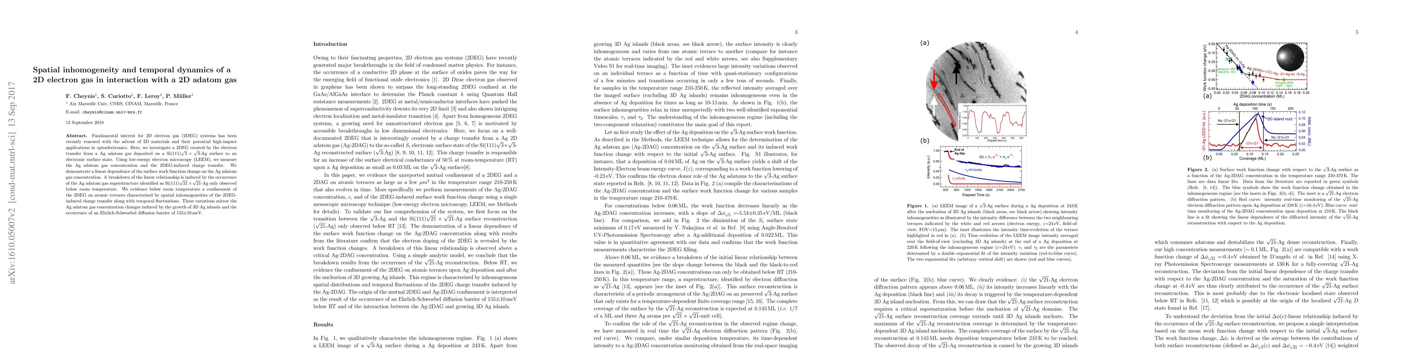 Fundamental interest for 2D electron gas (2DEG) systems has been recently renewed with the advent of 2D materials and their potential high-impact applications in optoelectronics. Here, we investigate a 2DEG created by the electron transfer from a Ag adatom gas deposited on a Si(111)$\sqrt{3}\times\sqrt{3}$-Ag surface to an electronic surface state. Using low-energy electron microscopy (LEEM), we measure the Ag adatom gas concentration and the 2DEG-induced charge transfer. We demonstrate a linear dependence of the surface work function change on the Ag adatom gas concentration. A breakdown of the linear relationship is induced by the occurrence of the Ag adatom gas superstructure identified as Si(111)$\sqrt{21}\times\sqrt{21}$-Ag only observed below room temperature. We evidence below room temperature a confinement of the 2DEG on atomic terraces characterised by spatial inhomogeneities of the 2DEG-induced charge transfer along with temporal fluctuations. These variations mirror the Ag adatom gas concentration changes induced by the growth of 3D Ag islands and the occurrence of an Ehrlich-Schwoebel diffusion barrier of 155$\pm$10meV.