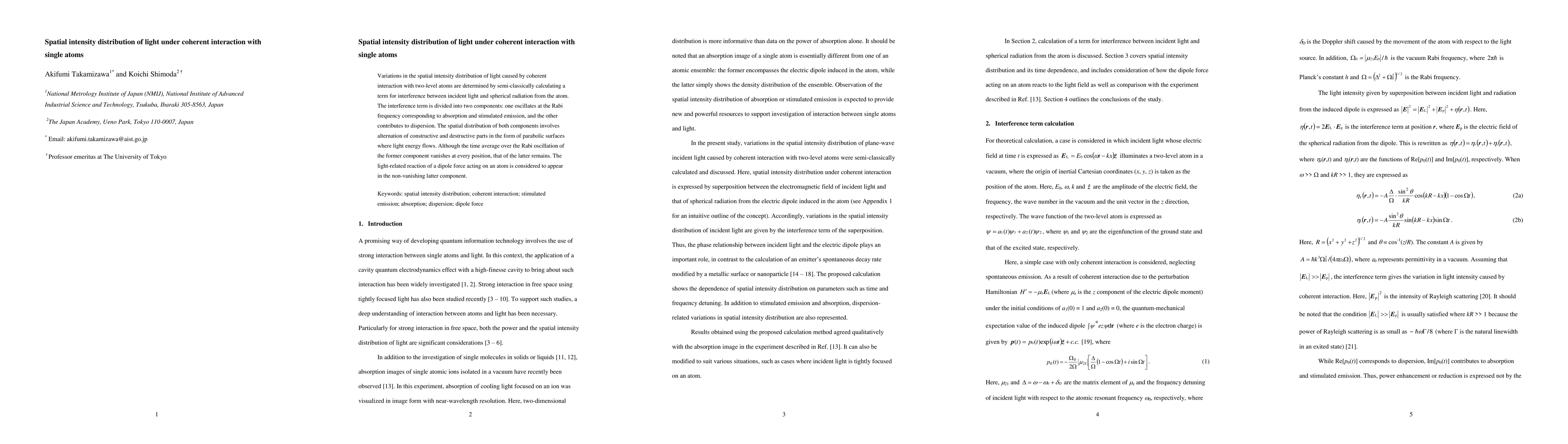 Variations in the spatial intensity distribution of light caused by coherent interaction with two-level atoms are determined by semi-classically calculating a term for interference between incident light and spherical radiation from the atom. The interference term is divided into two components: one oscillates at the Rabi frequency corresponding to absorption and stimulated emission, and the other contributes to dispersion. The spatial distribution of both components involves alternation of constructive and destructive parts in the form of parabolic surfaces where light energy flows. Although the time average over the Rabi oscillation of the former component vanishes at every position, that of the latter remains. The light-related reaction of a dipole force acting on an atom is considered to appear in the non-vanishing latter component.