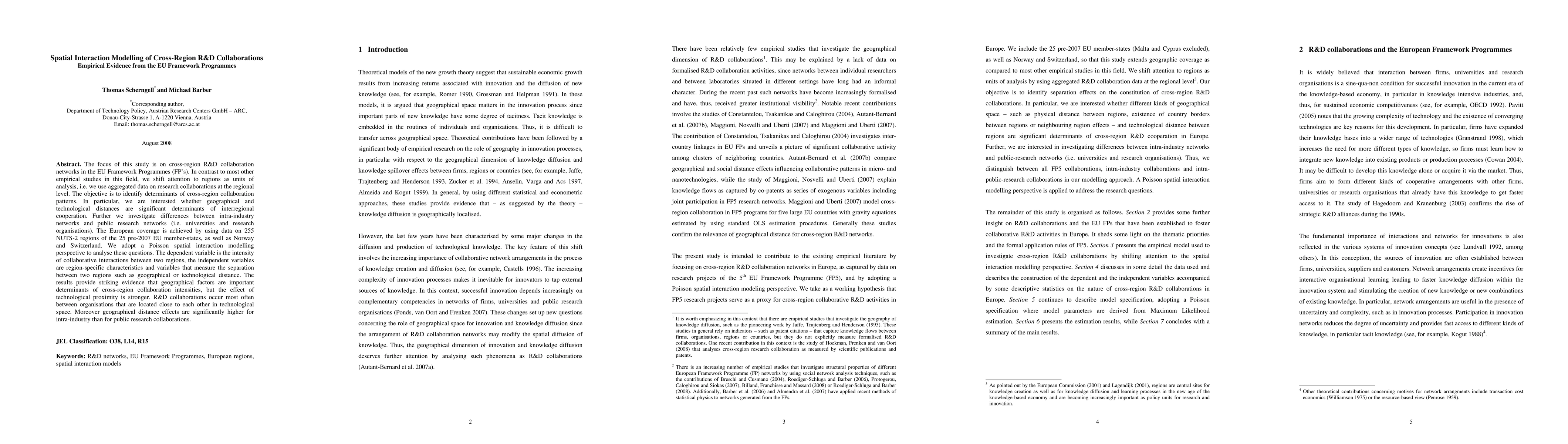 This study examines cross-region R&D collaboration networks in EU Framework Programmes using regional-level data from 255 NUTS-2 regions. It finds that geographical proximity is a significant determinant of collaboration, with technological proximity having an even stronger effect, especially in intra-industry networks.