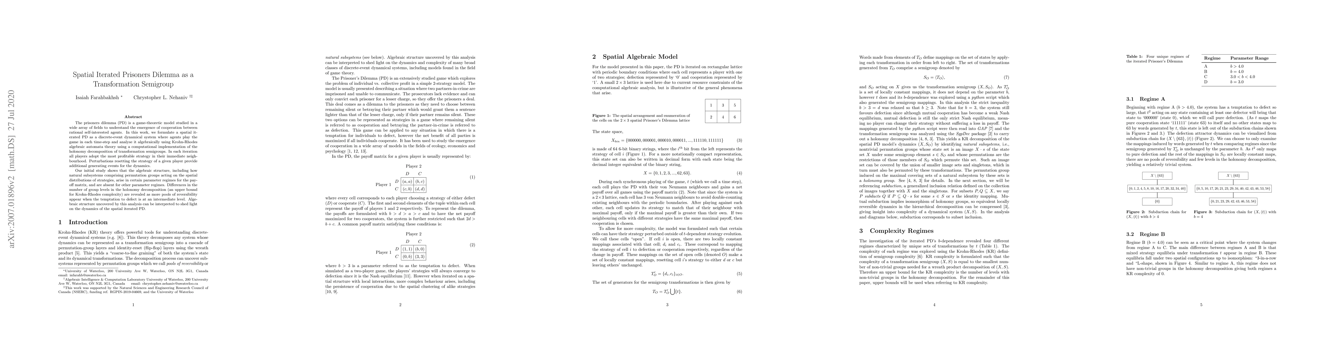 The prisoner's dilemma (PD) is a game-theoretic model studied in a wide array of fields to understand the emergence of cooperation between rational self-interested agents. In this work, we formulate a spatial iterated PD as a discrete-event dynamical system where agents play the game in each time-step and analyse it algebraically using Krohn-Rhodes algebraic automata theory using a computational implementation of the holonomy decomposition of transformation semigroups. In each iteration all players adopt the most profitable strategy in their immediate neighbourhood. Perturbations resetting the strategy of a given player provide additional generating events for the dynamics. Our initial study shows that the algebraic structure, including how natural subsystems comprising permutation groups acting on the spatial distributions of strategies, arise in certain parameter regimes for the pay-off matrix, and are absent for other parameter regimes. Differences in the number of group levels in the holonomy decomposition (an upper bound for Krohn-Rhodes complexity) are revealed as more pools of reversibility appear when the temptation to defect is at an intermediate level. Algebraic structure uncovered by this analysis can be interpreted to shed light on the dynamics of the spatial iterated PD.