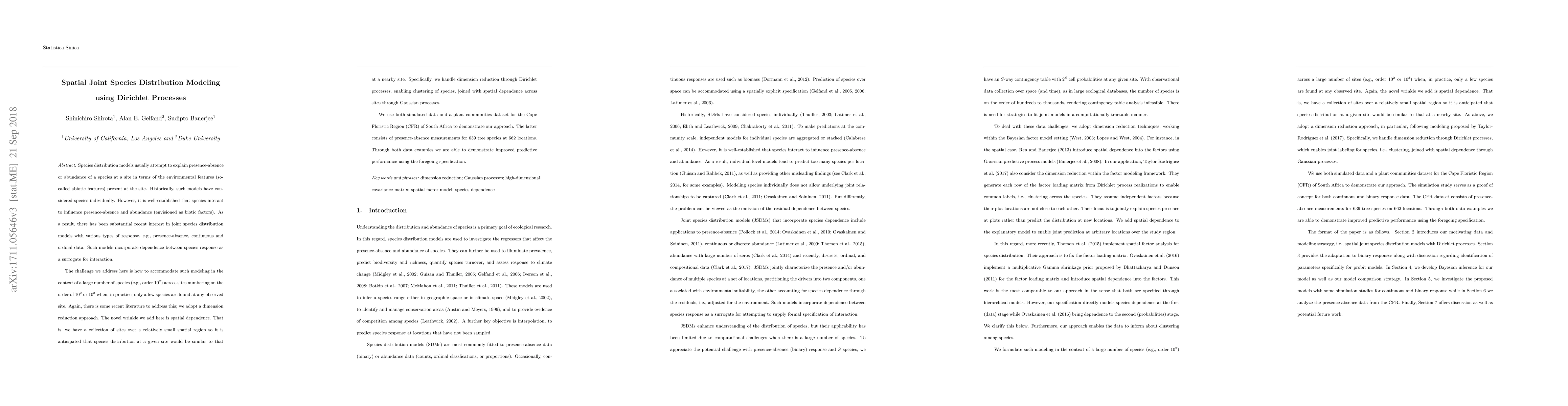 This paper proposes a spatial joint species distribution model using Dirichlet processes for dimension reduction and Gaussian processes to incorporate spatial dependence, addressing the challenge of modeling large numbers of species across numerous sites. The approach demonstrates improved predictive performance on both simulated data and a real dataset from the Cape Floristic Region of South Africa.