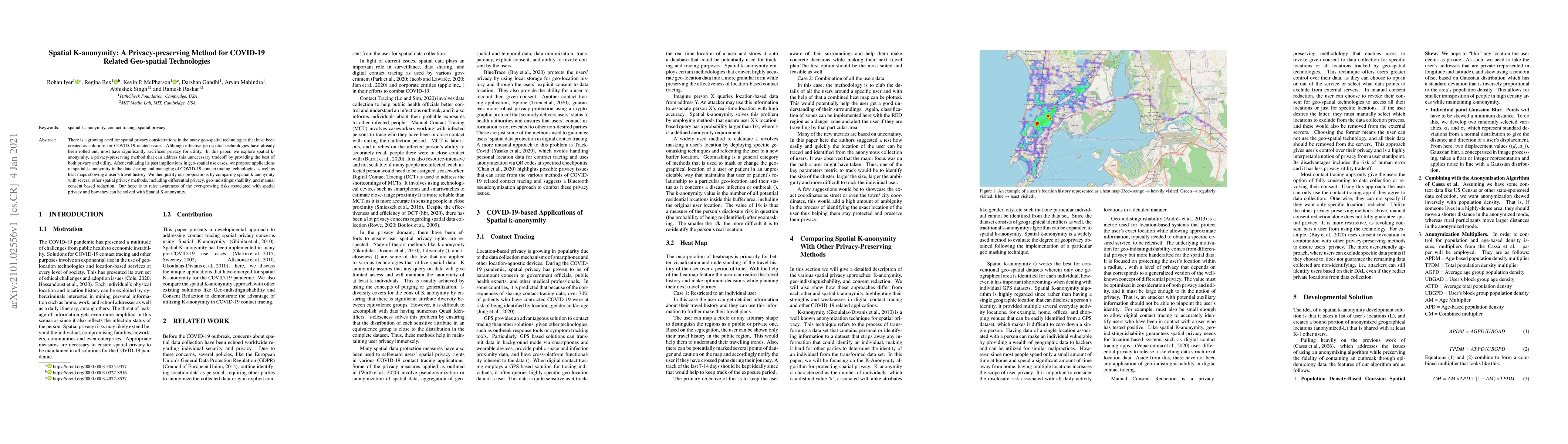 This paper introduces spatial k-anonymity as a privacy-preserving method for geospatial technologies addressing COVID-19, aiming to balance privacy and utility. It proposes its application in COVID-19 contact tracing and travel history heat maps, comparing it favorably against other spatial privacy methods.