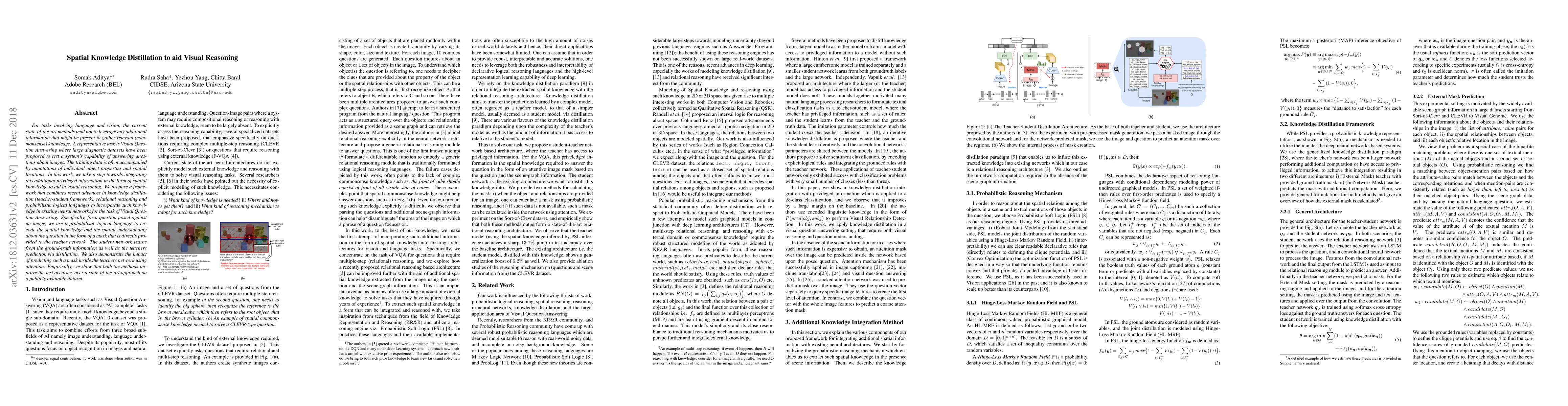 For tasks involving language and vision, the current state-of-the-art methods tend not to leverage any additional information that might be present to gather relevant (commonsense) knowledge. A representative task is Visual Question Answering where large diagnostic datasets have been proposed to test a system's capability of answering questions about images. The training data is often accompanied by annotations of individual object properties and spatial locations. In this work, we take a step towards integrating this additional privileged information in the form of spatial knowledge to aid in visual reasoning. We propose a framework that combines recent advances in knowledge distillation (teacher-student framework), relational reasoning and probabilistic logical languages to incorporate such knowledge in existing neural networks for the task of Visual Question Answering. Specifically, for a question posed against an image, we use a probabilistic logical language to encode the spatial knowledge and the spatial understanding about the question in the form of a mask that is directly provided to the teacher network. The student network learns from the ground-truth information as well as the teachers prediction via distillation. We also demonstrate the impact of predicting such a mask inside the teachers network using attention. Empirically, we show that both the methods improve the test accuracy over a state-of-the-art approach on a publicly available dataset.