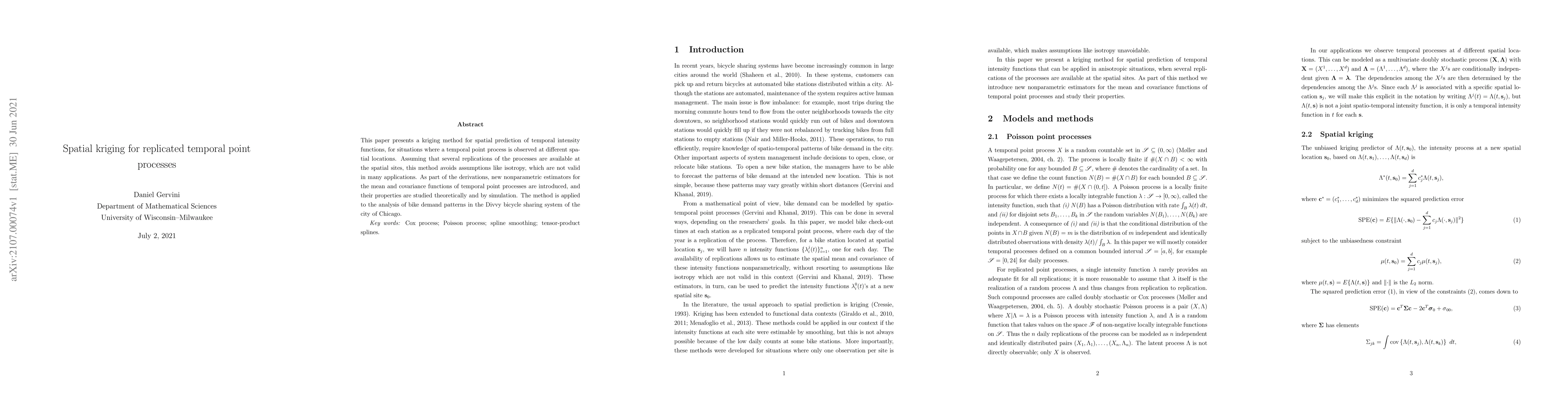 This paper introduces a kriging method for spatial prediction of temporal intensity functions in replicated temporal point processes, avoiding assumptions like isotropy. It applies to bike demand patterns in Chicago's Divvy system, using new nonparametric estimators for mean and covariance functions.